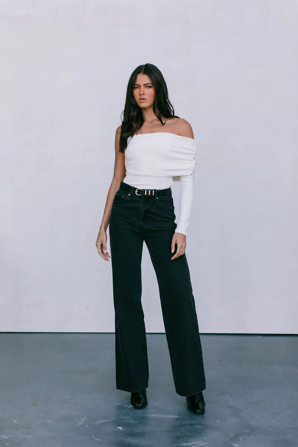 Effortlessly elevate your style in our Akira Top. This bone-hued, asymmetrical top boasts an off-shoulder neckline + chic ruching offers flattering, fitted silhouette. Perfect for styling from day-to-night, pair with denim + jewels for date night.