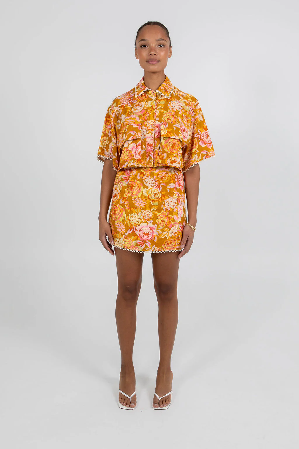 Blend elegance + playfulness in our exclusive Aprire Mini Skirt by BAIA. This floral printed mini is adorned with sweet scallop embroidery for an extra feminine touch. Style with our matching Esimio Cropped Shirt for a head-turning matching set.