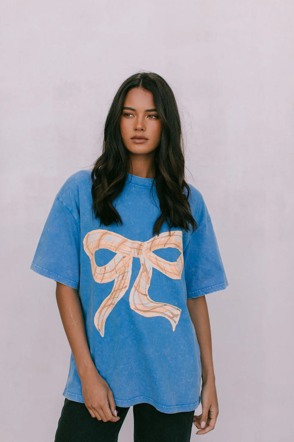 Blue acid-wash finish t-shirt, with a cool yellow bow graphic print by MAKU. Oversized, boyfriend fit. She brings effortless style + comfort to every woman's wardrobe.