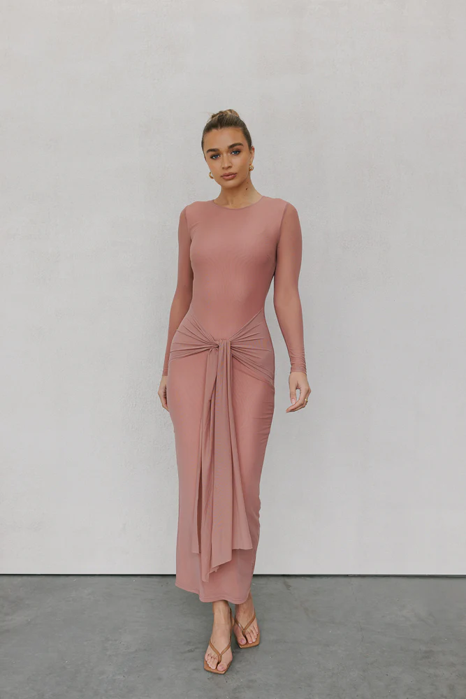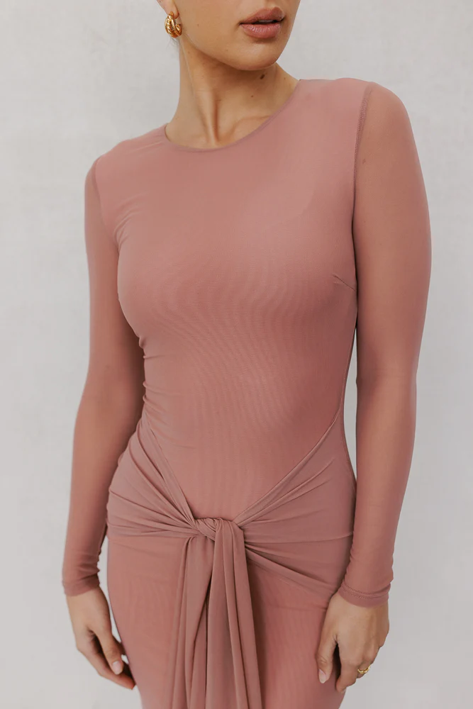 Showcasing timeless design, Bobbi will beautifully flatter your figure. Boasting a stunning rose-hued mesh, she midi embodies elegance + sophistication. Her refined round neckline + fitted silhouette features a charming tie detail to finish your look.