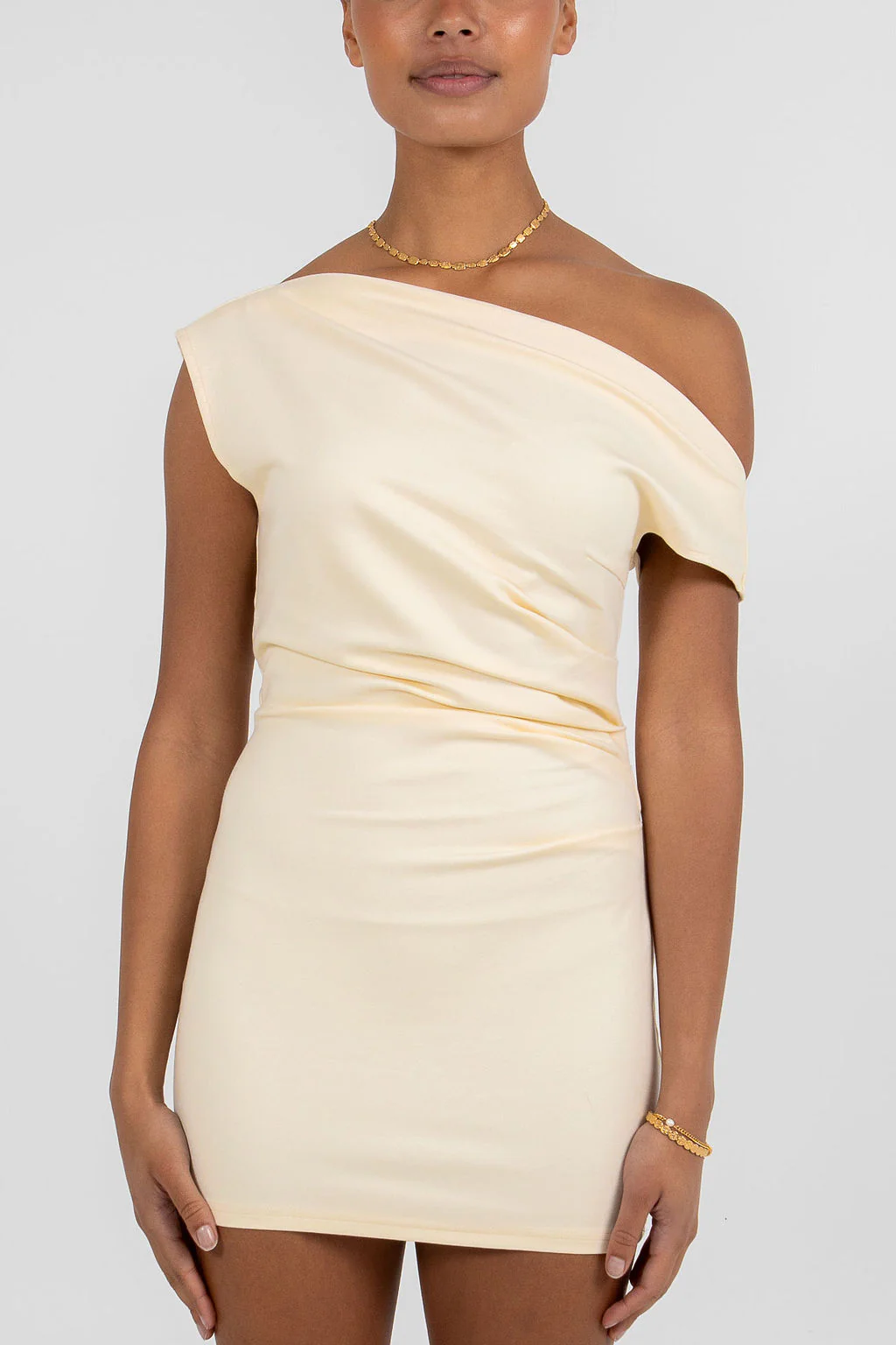 The Brydie Dress in soft lemon features a flirty mini length with a ruched bodice and an elegant asymmetrical neckline. Bright, playful, and effortlessly chic, it’s perfect for adding a fresh, sun-kissed touch to any occasion.