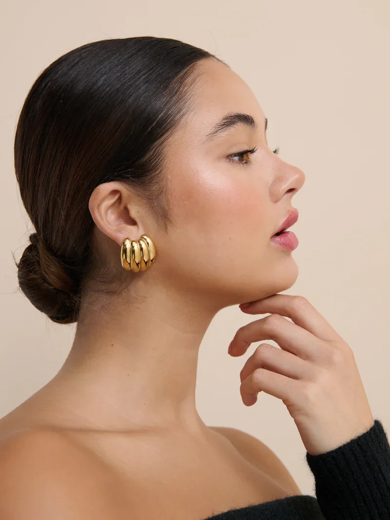 Our Carmel Studs are the ultimate statement stud. With a timeless + chic art deco inspired design they are a classic pair to have in your jewelry box.