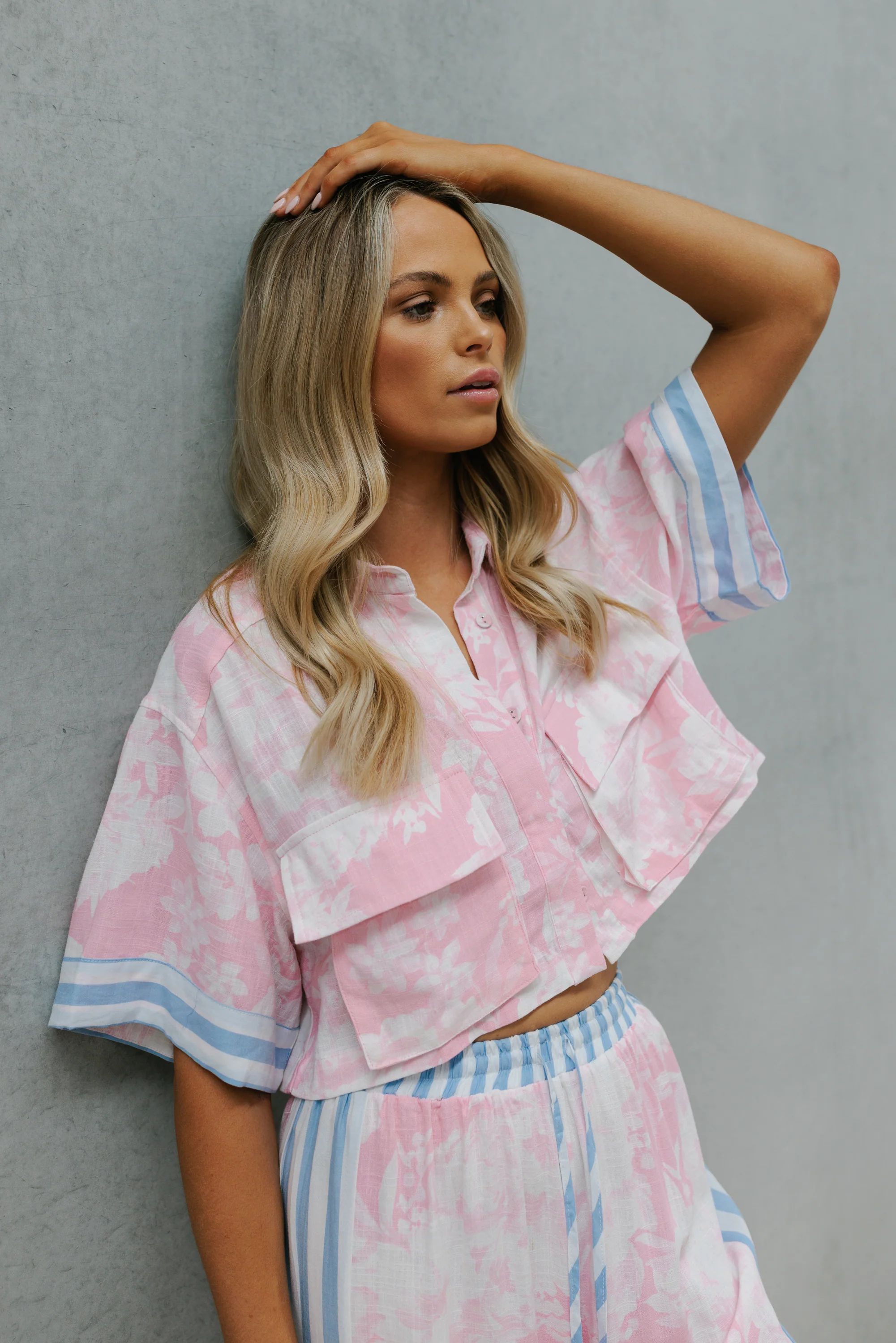 Meet our Citta Pants by BAIA. Her effortless, relaxed silhouette showcases an exclusive pink floral print with contrasting blue stripe panels, offers comfort + style. Perfect for a casual yet polished look, pair as a set with our Esimio Cropped Shirt.