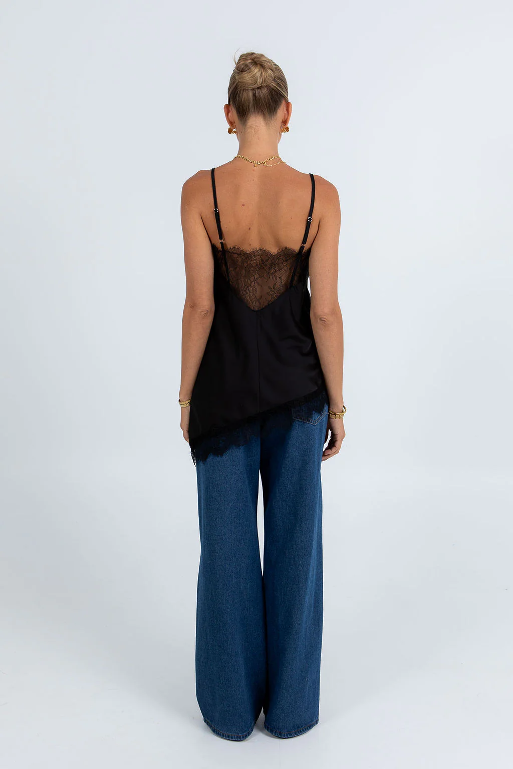 The Jessalyn Top exudes sophistication with thin adjustable straps, a satin-look finish, and delicate lace at the neckline, hem, and back. The asymmetrical hem adds modern elegance, perfect for evening wear or elevated styling.