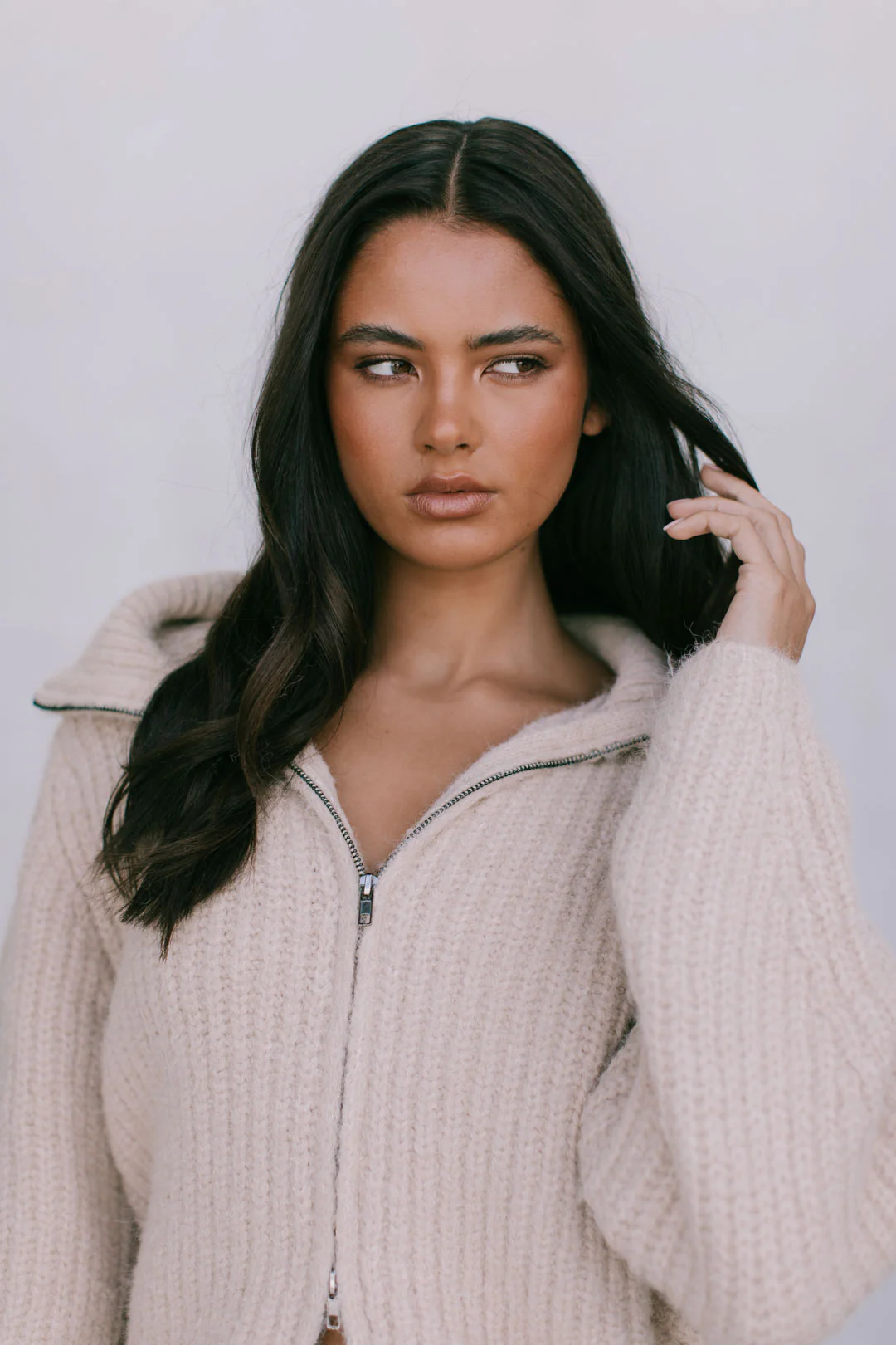 Thick, cozy beige knitted zip front cardigan