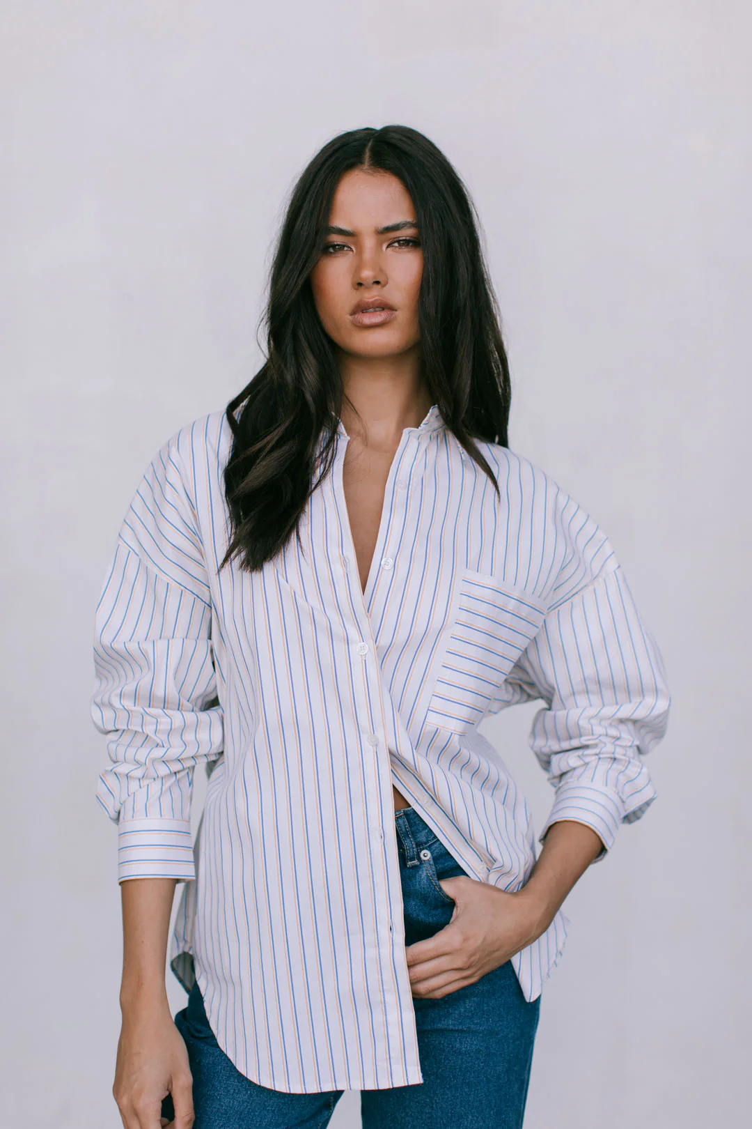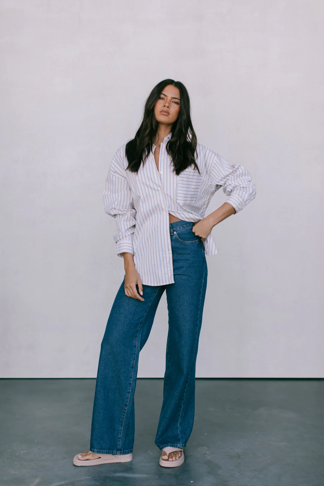 Meet Declan, blending effortless style + everyday comfort. A relaxed boyfriend fit, this striped staple blends classic with a modern edge. The bone base features blue + mustard stripes, with a longer scooped hem for an easygoing yet polished look.