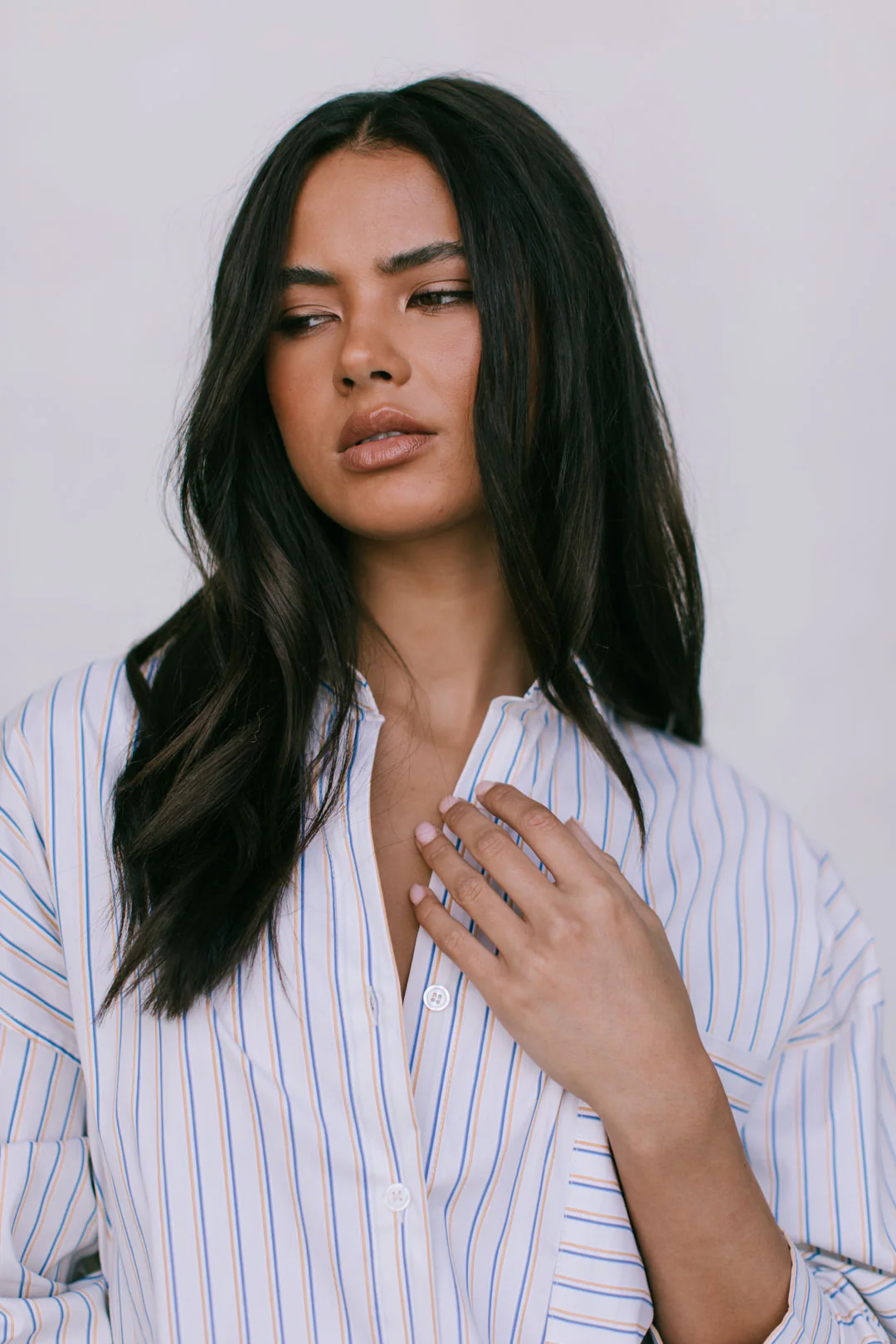Ultra-oversized, boyfriend style tailored shirt. Longer length hemline. Blue + mustard stripe on a cream base.