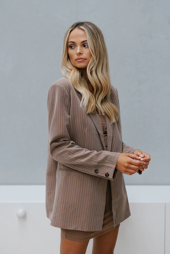 Our Eloise Blazer is the epitome of timeless sophistication. A classic mocha blazer with delicate white pinstripe accents, offers understated elegance to any ensemble. A relaxed silhouette exudes confidence ~ a staple piece for the modern girl.