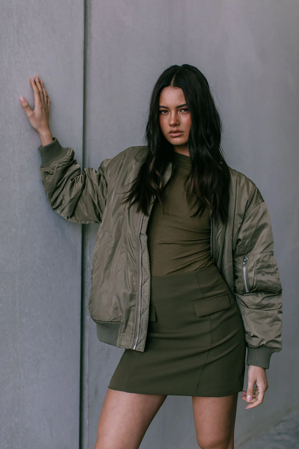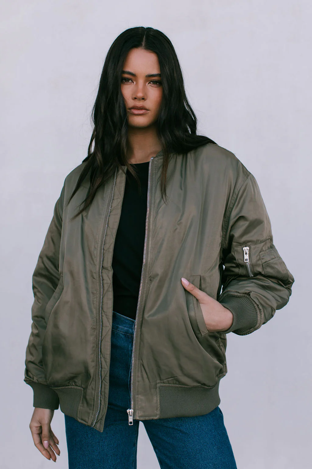 Level up your street style in our Estar Bomber Jacket. Featuring a luxe, khaki green sateen finish, relaxed fit with utility pocket detail, this oversized bomber is a must-have outerwear piece for any off-duty or casual-cool wardrobe.