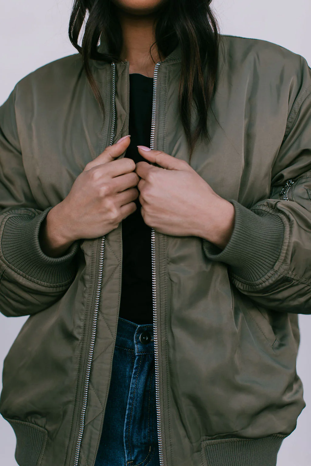 Khaki green sateen finish bomber jacket for women. Oversized, relaxed fit.