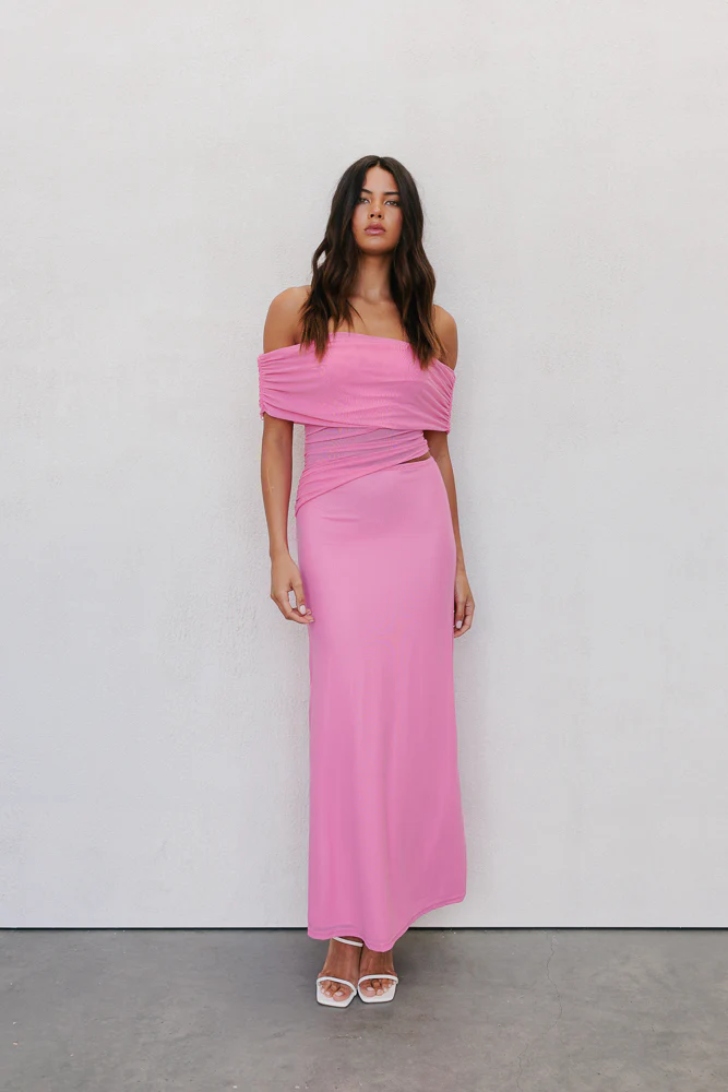 Stand out in our Fiora Dress. A stunning pink mesh midi with sheer mesh + cut-out details for a chic, modern look. Her off-shoulder folded neckline + asymmetrical hip cut-out adds a bold touch. Make a memorable impression in Fiora.