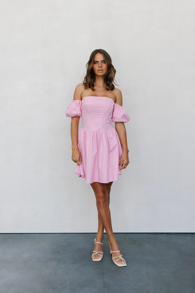 Our Frida Dress is the epitome of sweet elegance. This mini boasts a strapless neckline + off-shoulder puff sleeves for a romantic touch. Designed with a fitted bodice enhanced with boning for a flattering fit, into a playful a-line mini silhouette.