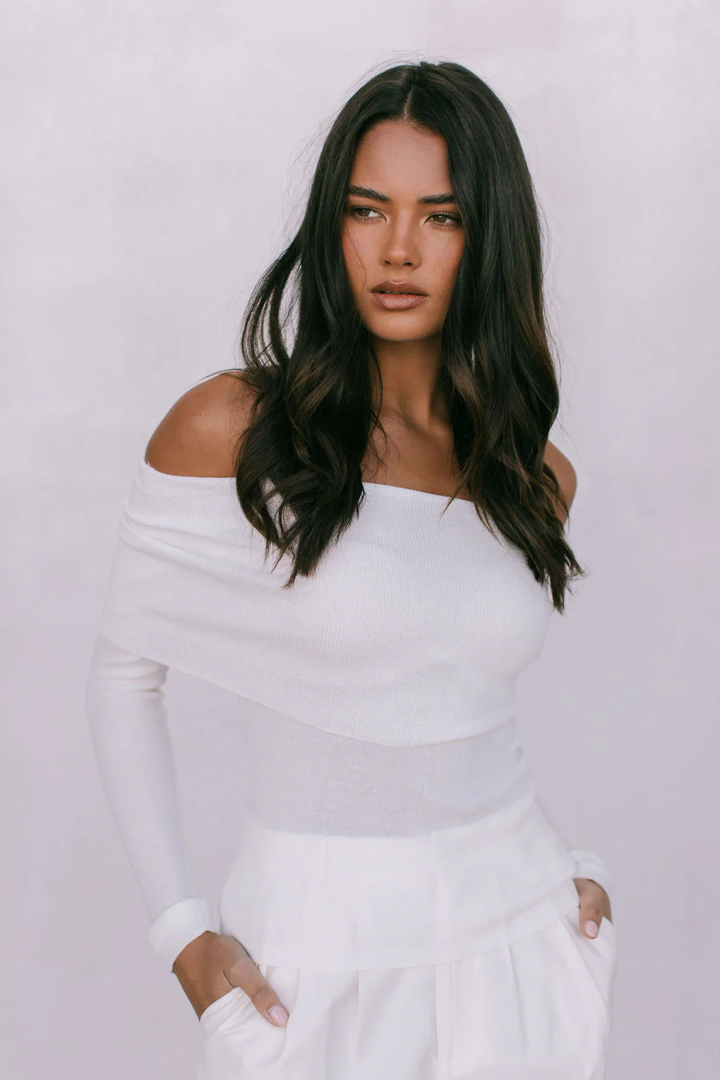 Elevate your style in our exclusive Garnet Top by Rosie. Designed to flatter, this ivory white off-shoulder knit top boasts a folded neckline + fitted silhouette. Outfit day to night, this versatile knit top is perfect for layering or styling alone.