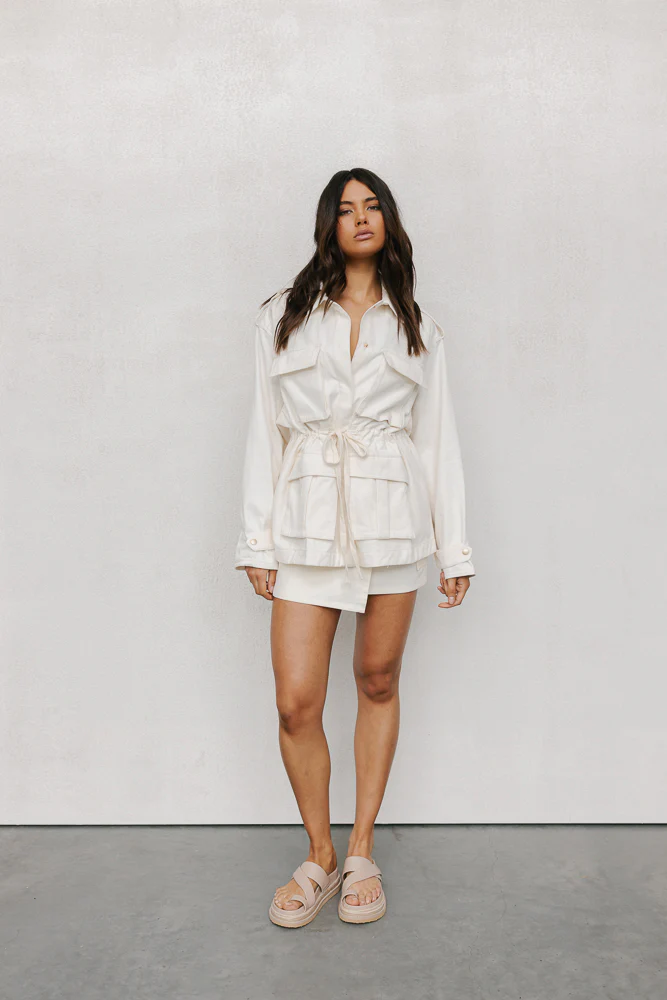 This cream utility jacket features a classic collar and multiple pocket details for a touch of practicality. The adjustable cinch waist allows for a customized fit, accentuating your silhouette while maintaining a sleek, streamlined look. Perfect for layering, this jacket adds a polished yet casual edge to any outfit.