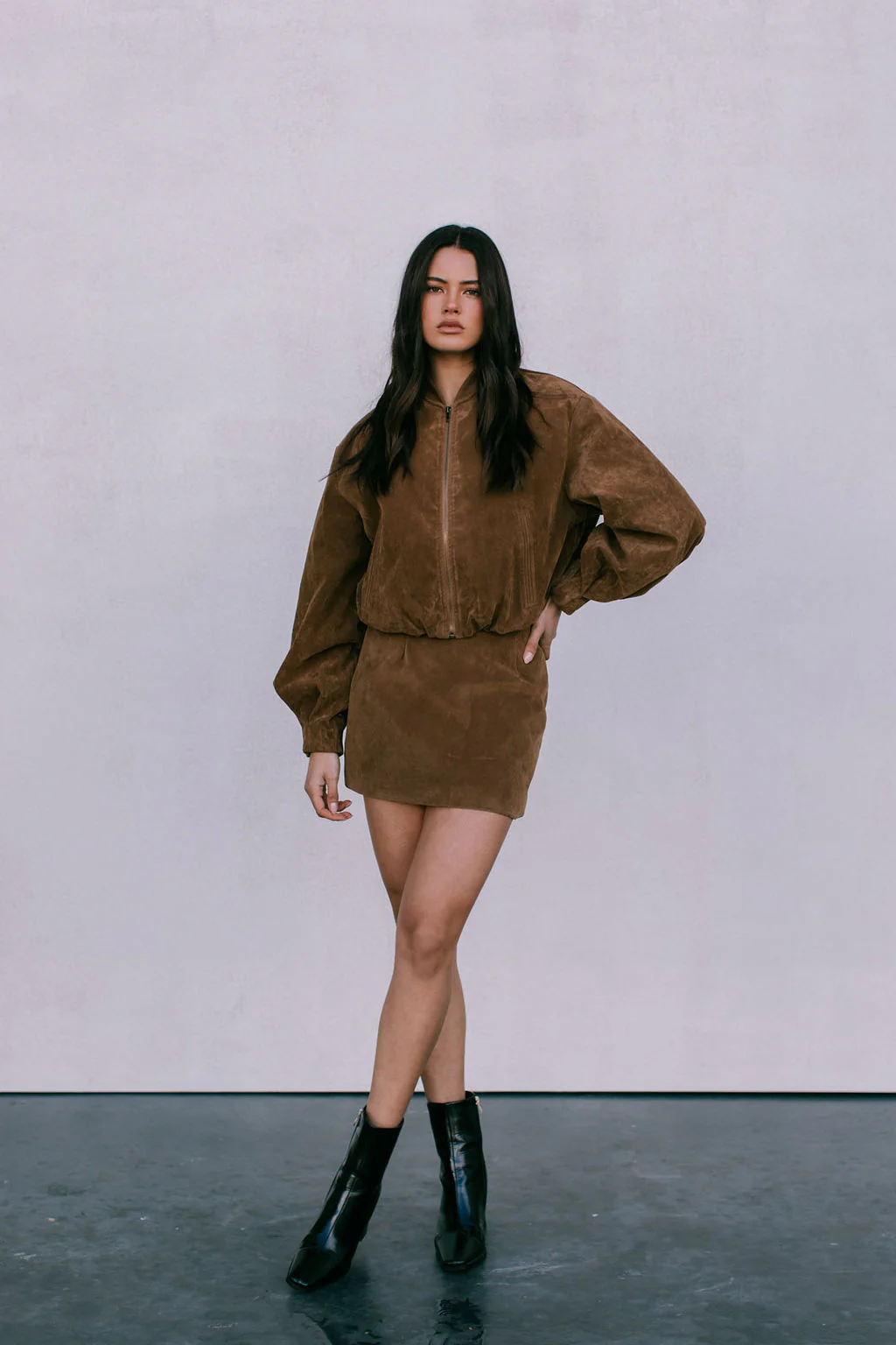 Our Gina Mini Skirt is your new go-to for effortless style. Crafted in a luxe vegan suede-look fabric, this structured a-line mini skirt offers a ultra flattering fit. Perfect for day-to-night dressing, or styled as a set with our Diego Bomber Jacket.