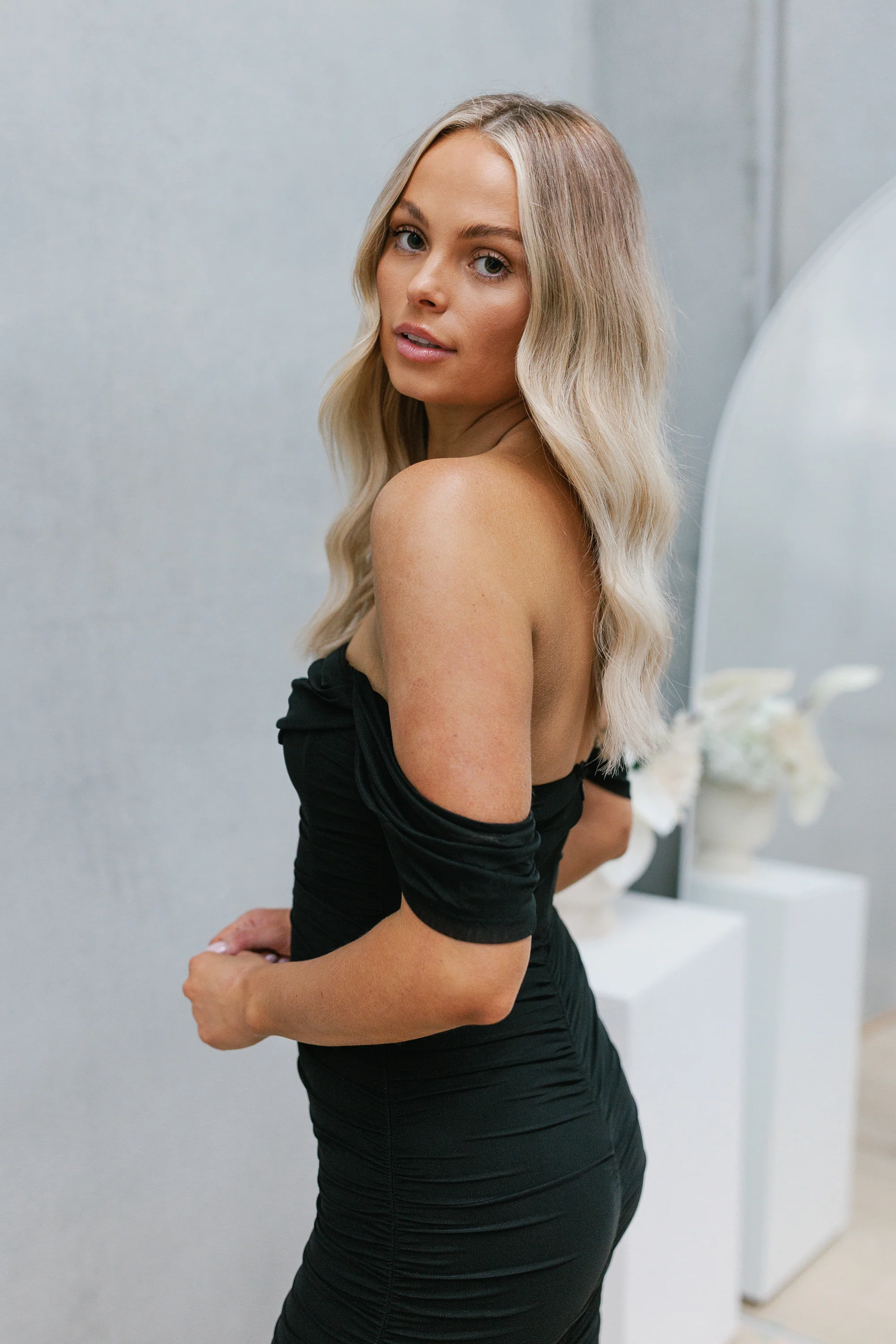 Make your mark in Hilary ~ this gorgeous black mesh midi dress is classic yet confident. She features all over ruching + mesh off shoulder sleeves, hugging the body in her feminine silhouette. The ultimate for black tie weddings + formal occasions.