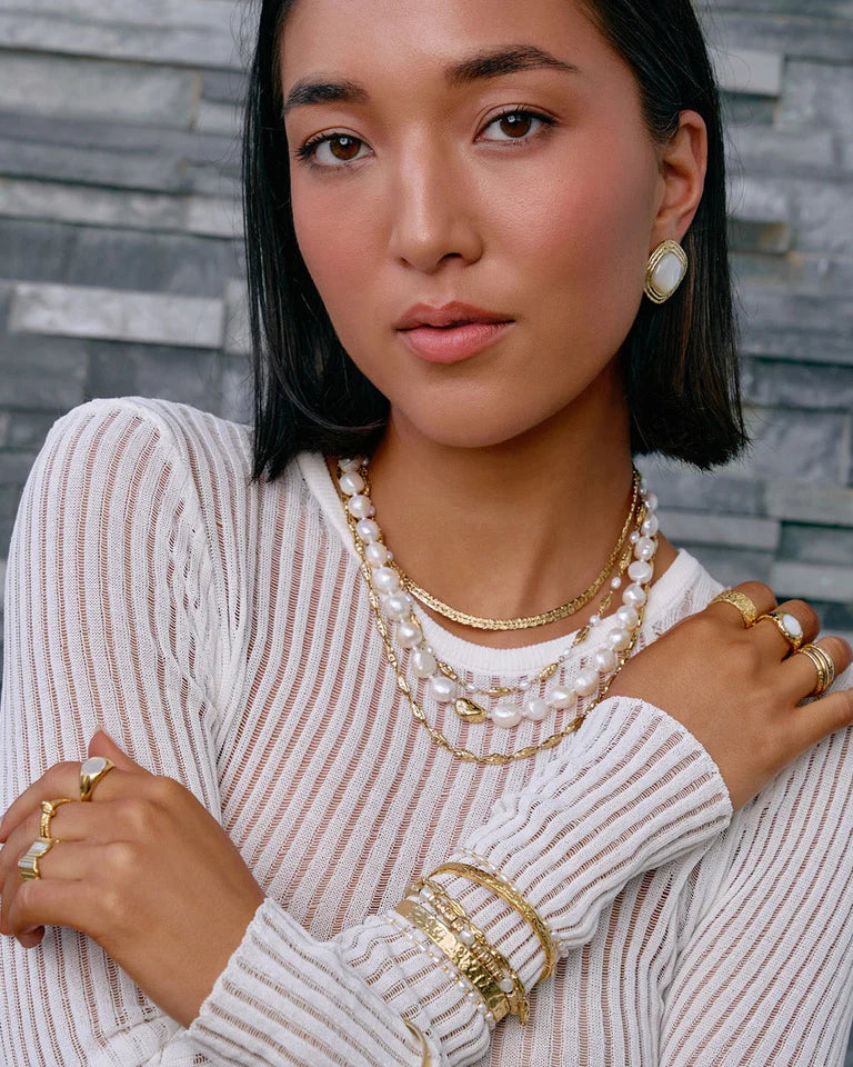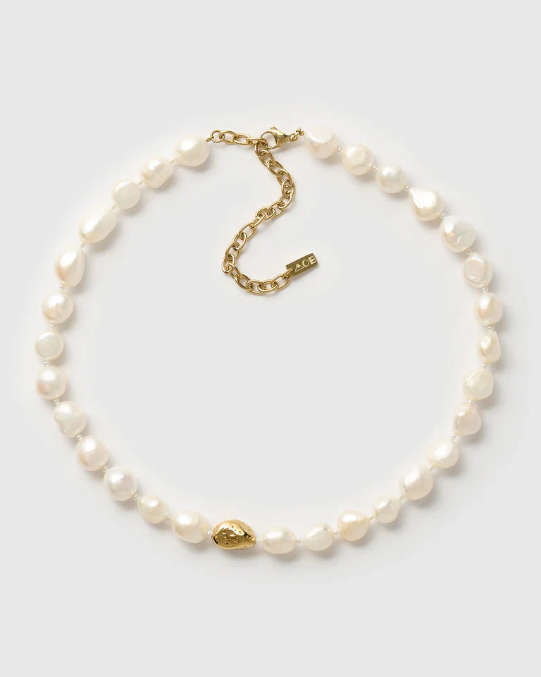 Elegant and classy, the Hariette Necklace features organic freshwater pearls and a golden bead. Pair with the matching Hariette Bracelet for a chic, show-stopping look perfect for any special occasion.