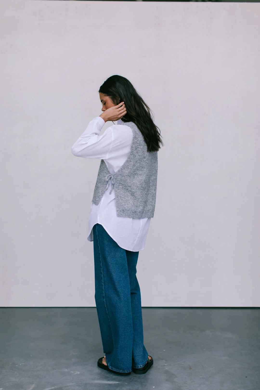 Fluffy, grey marle knitted vest with tie details