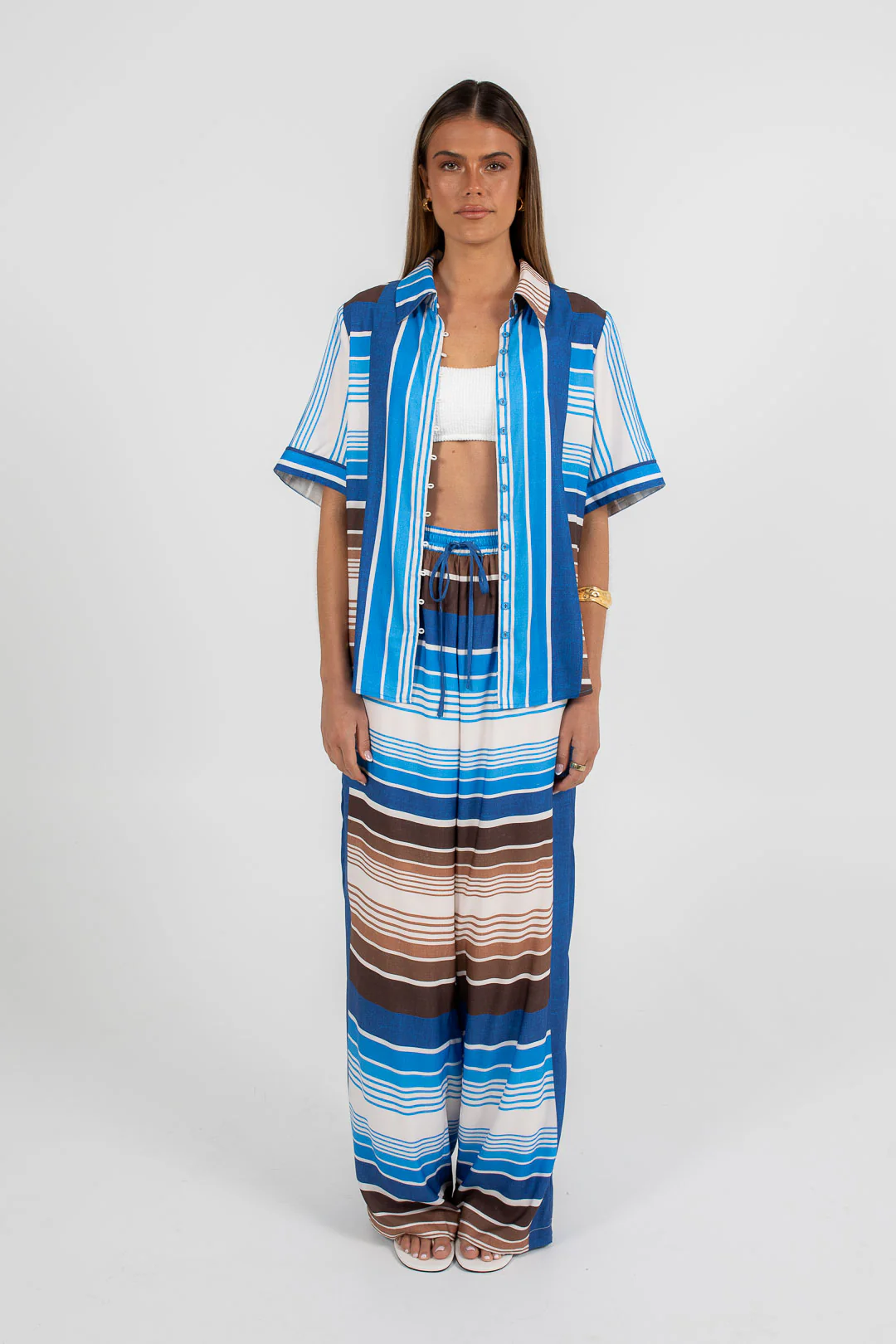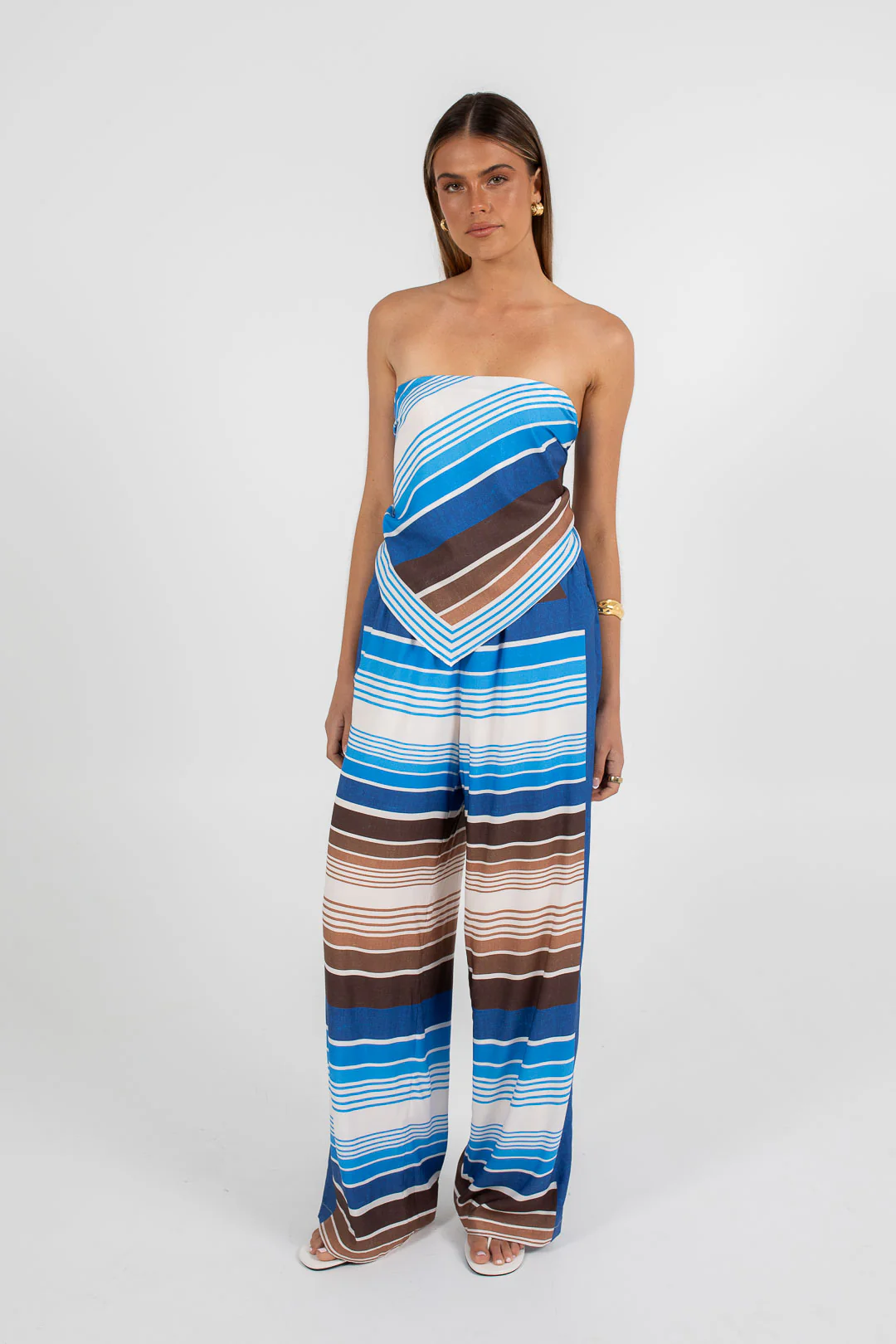 Step up your style with the Ithaca Pants by Cinque. Wide leg and relaxed in deep blue and brown stripes, made for the cool girl. Pair with our Gavdos Scarf Top for a chic, coordinated set perfect for long lunches and laid-back weekend outings.