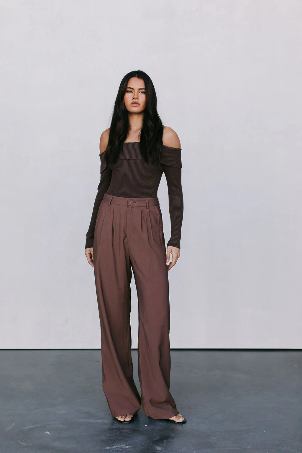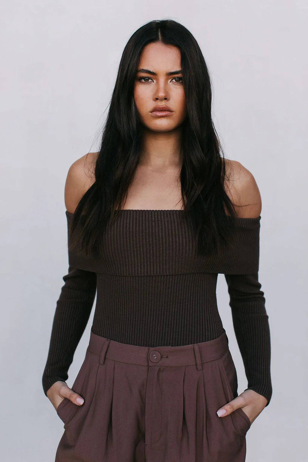 Embrace elegance in our Kahlea Bodysuit in a MMB exclusive chocolate brown. Crafted in a cozy, soft ribbed knit, she boasts an off-the-shoulder neckline + long sleeves. Style with denim for smart-casual or tailored pants for dinner + drinks.