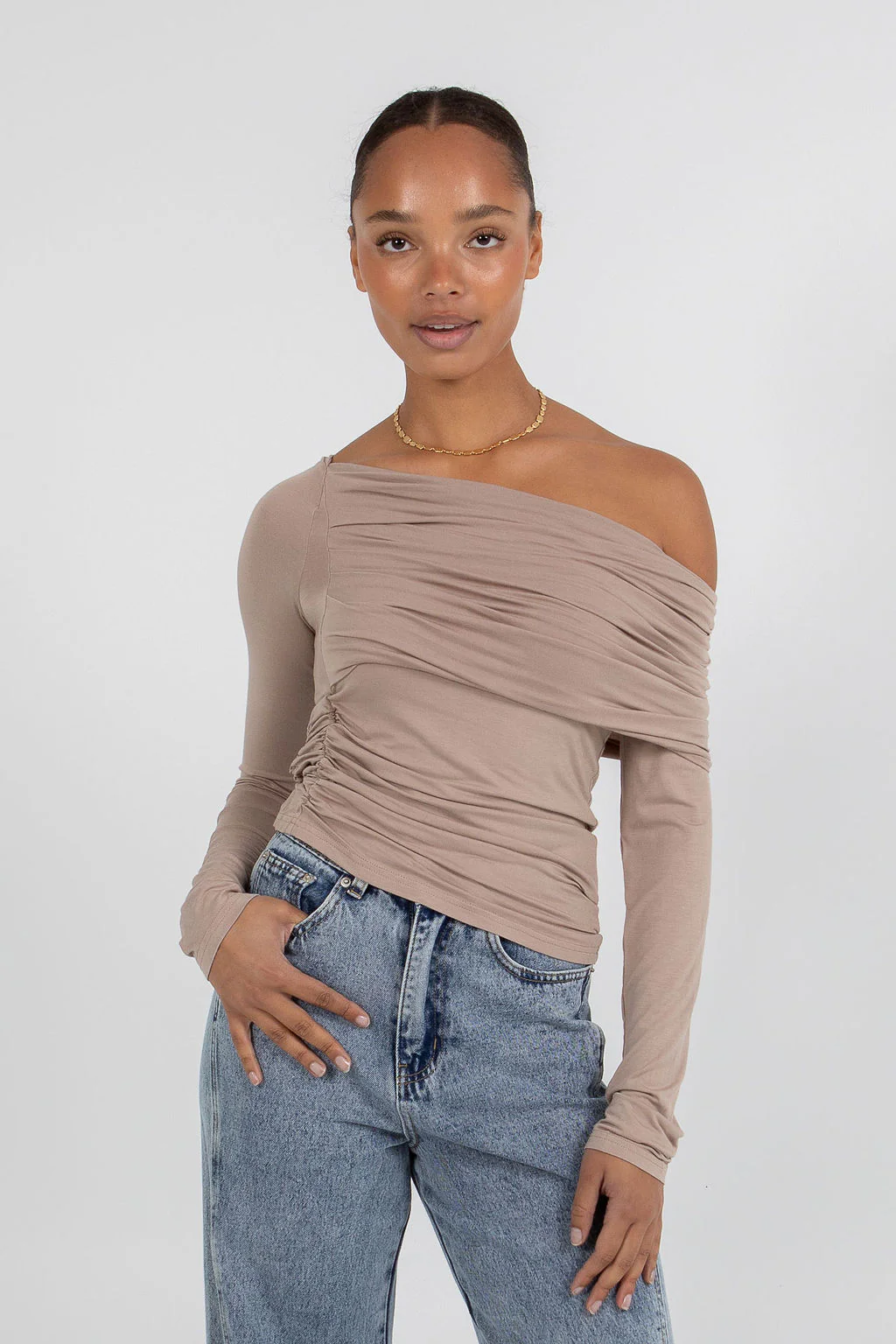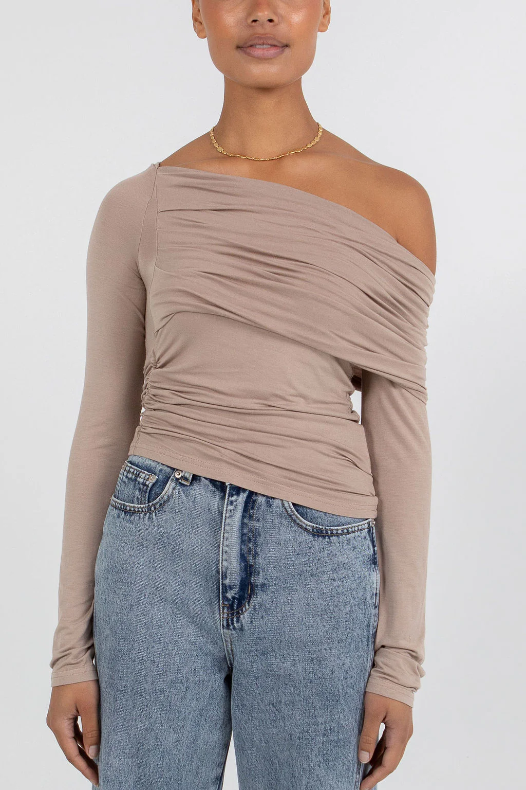 Flattering asymmetrical long-sleeve top with rouching detail for women. Latte fabrication.