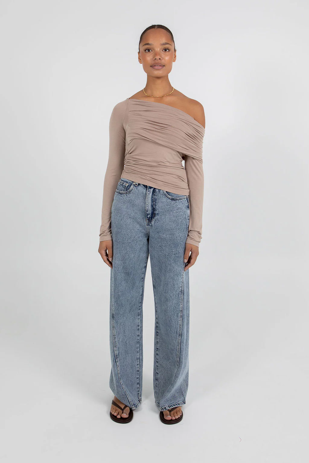 Meet the Kaya Top. A latte long sleeve with a folded neckline, asymmetrical hem and flattering side rouching. Finished with a sleeve and a fitted silhouette, she brings an effortless modern edge to your look.