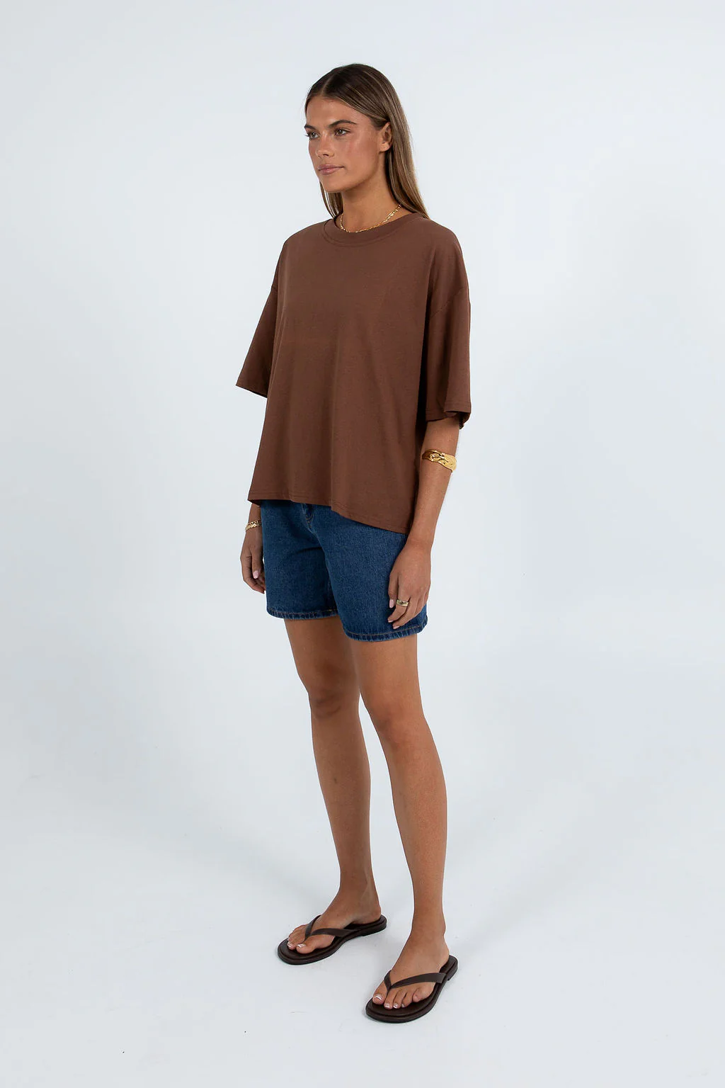 Rich chocolate brown boyfriend tee. Ultra relaxed, boxy silhouette.