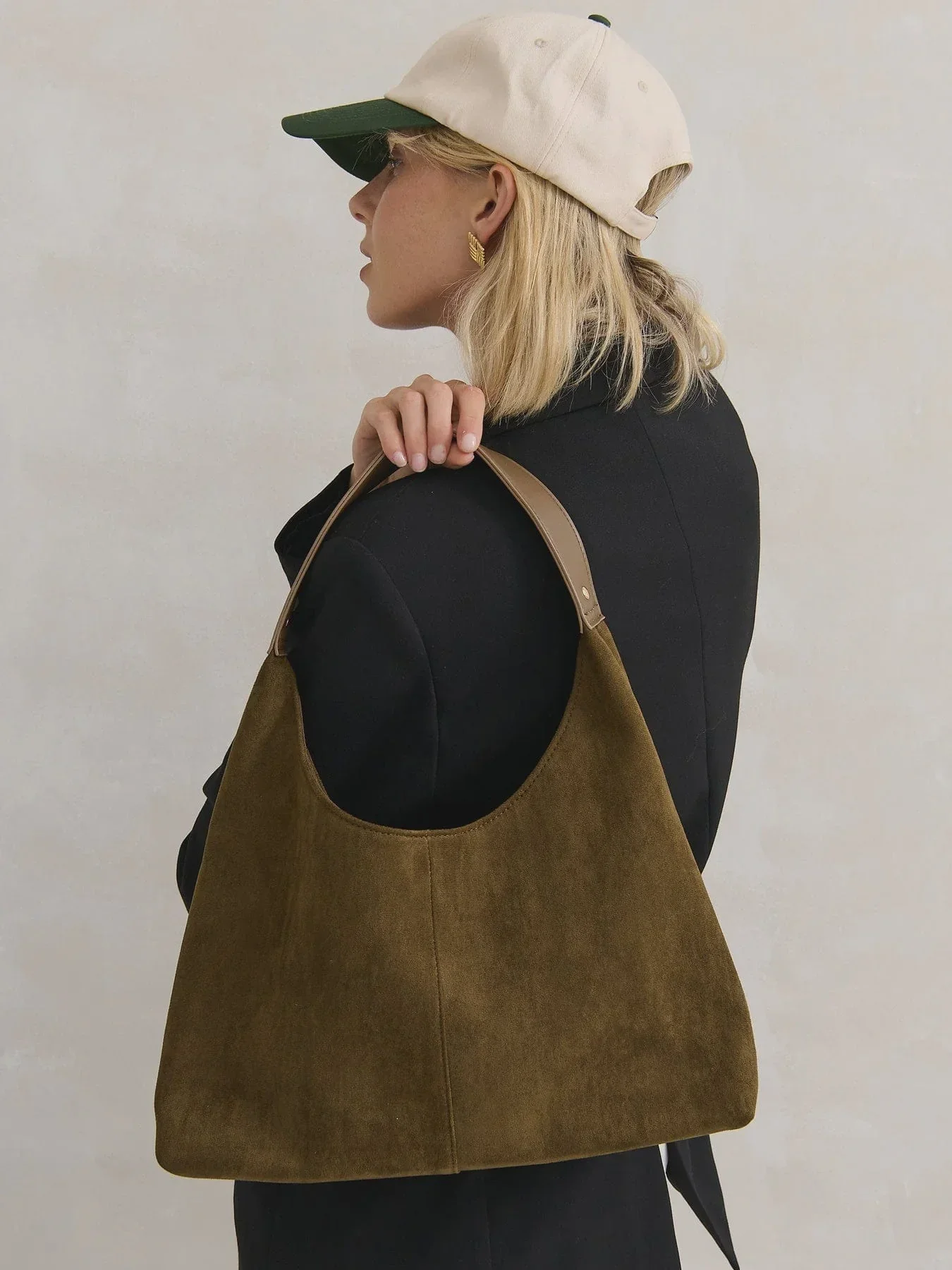 Slouchy, relaxed hobo handbag in vegan khaki suede finish.
