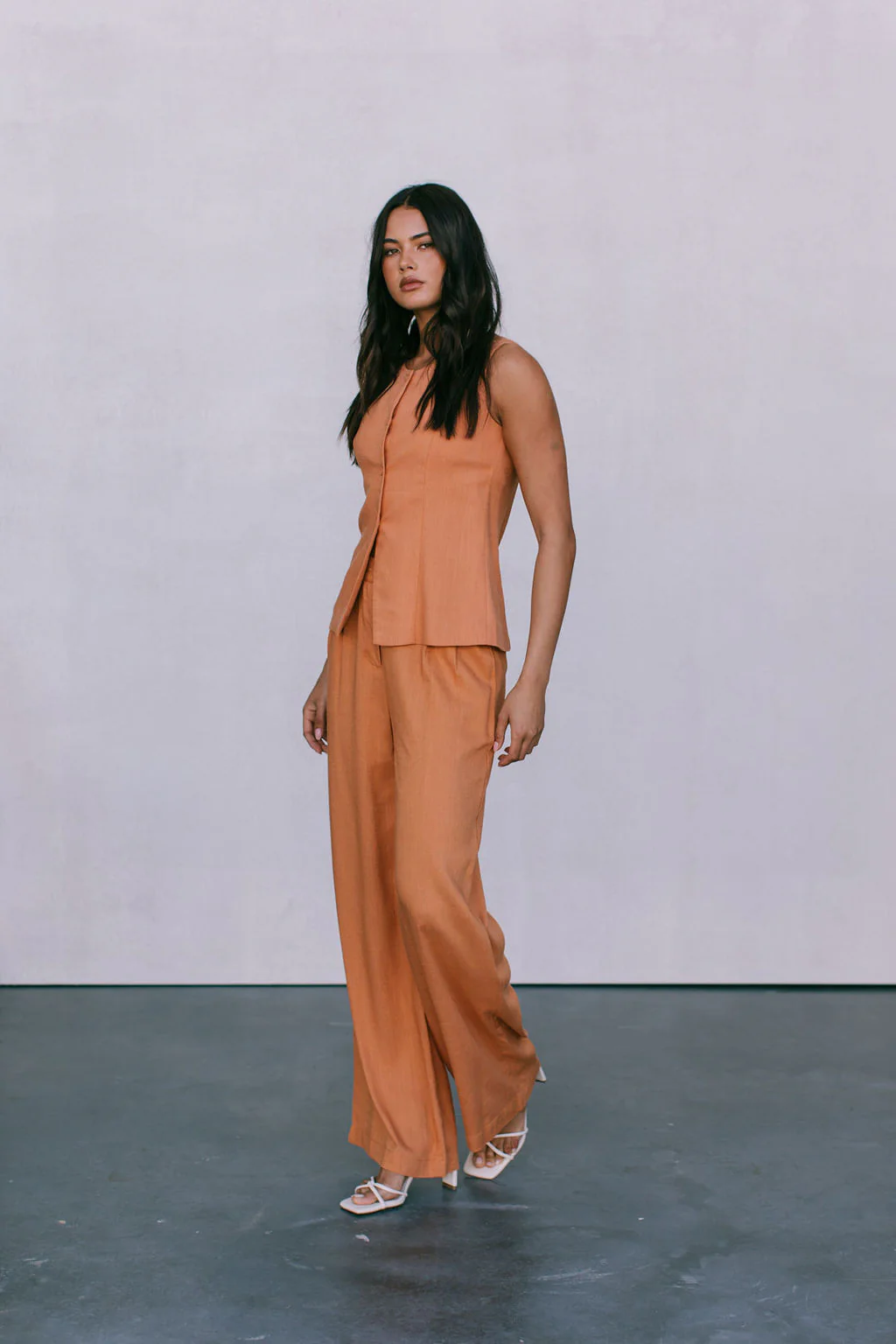 Our Leo Pants are a polished yet easygoing staple in a beautiful, burnt rust linen blend. Her subtle dart details, relaxed tailored fit + comfortable stretch elastic waistband offers a flattering fit. Wear solo or pair as a set with our Virgo Vest.
