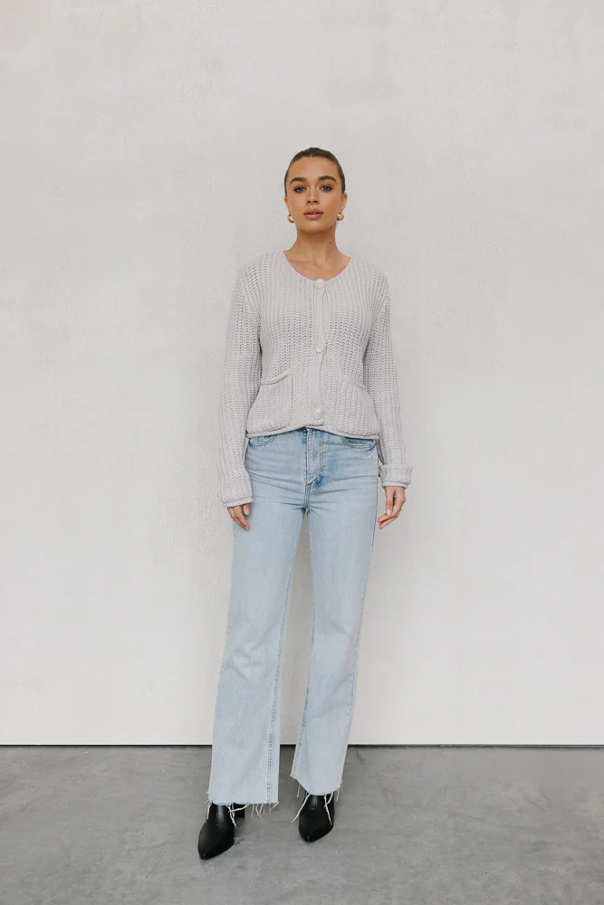 Our Liam Cardigan is a cute ice grey knit cardigan that combines comfort with style. Her scooped round neckline + a boxy fit, this cardi offers a relaxed silhouette perfect for layering. A versatile addition to any wardrobe.
