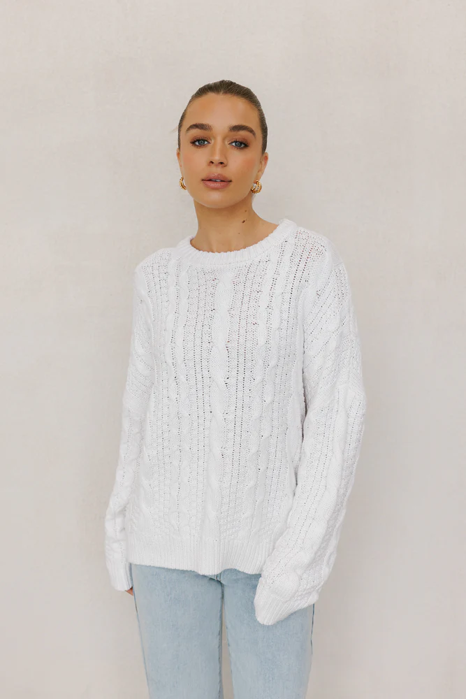 Our Madrid Jumper is a cozy + stylish piece perfect for your wardrobe. This crisp white cable knit boats an ultra-relaxed, boxy silhouette for ultimate comfort. Madrid effortlessly combines comfort + chic design, a must-have for any season.
