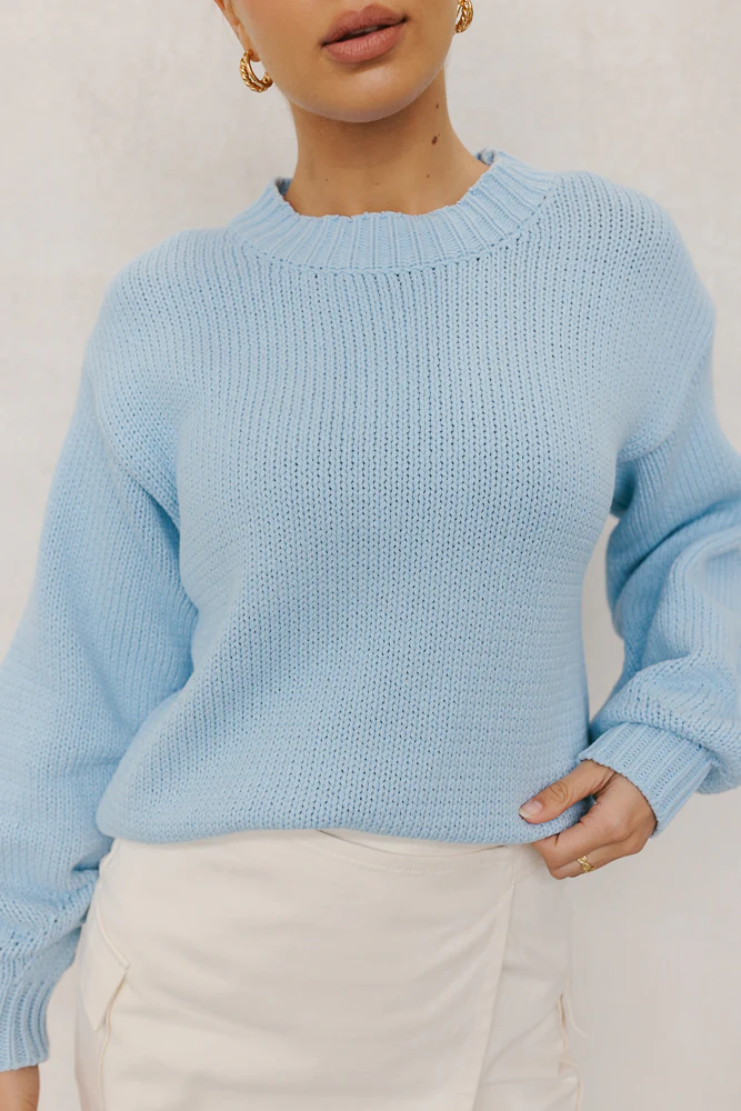 Cozy, relaxed silhouette knitted jumper for women. Cool light blue knit fabrication.