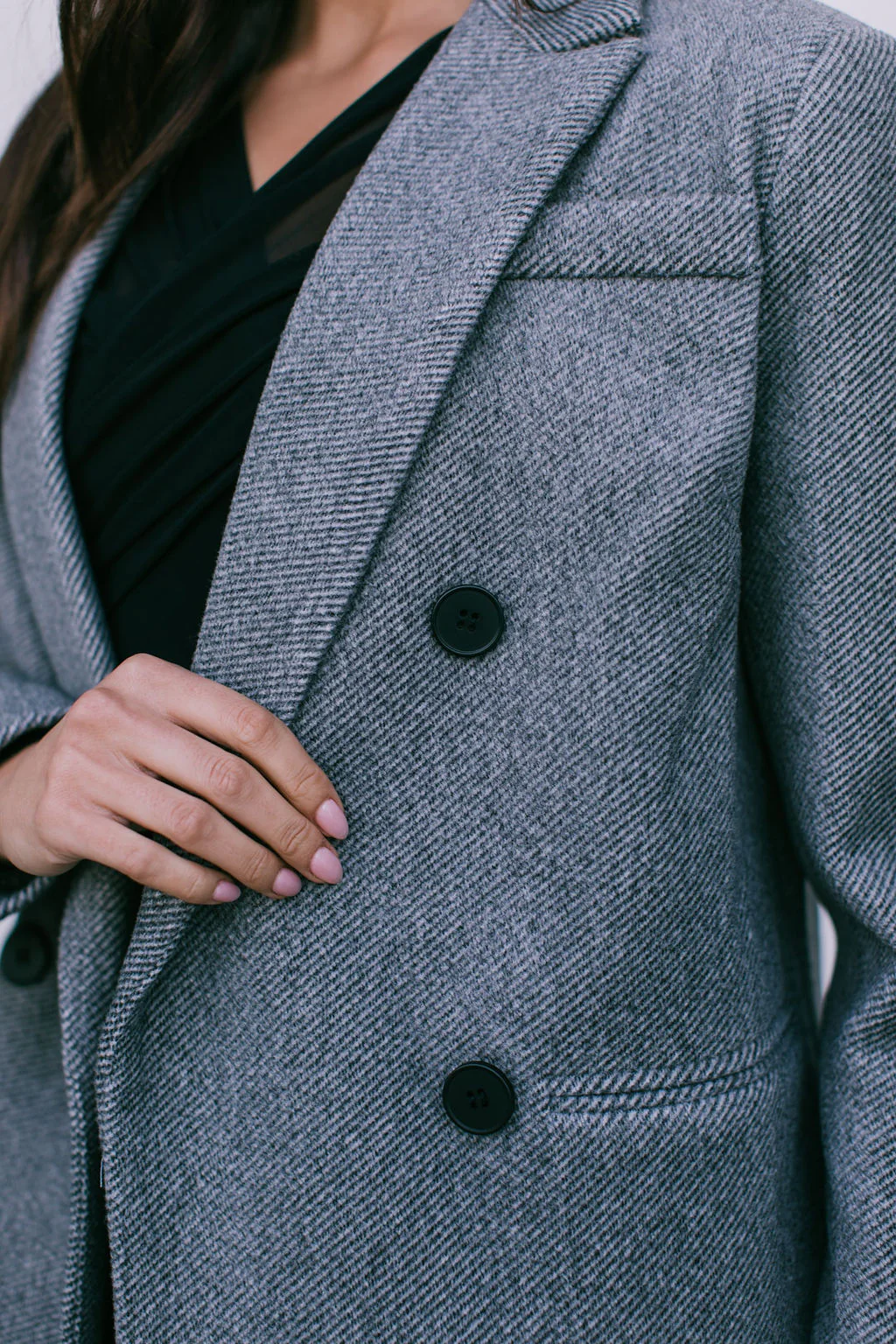 Relaxed, oversized boyfriend fit blazer for woman. Textured, wool-blend charcoal grey fabrication.