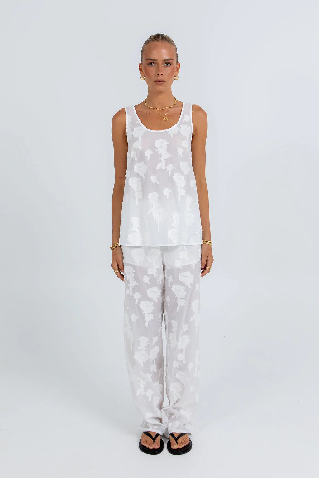 The Mirabel Singlet, exclusive to MMB, features white embroidered lace in a structured yet loose fit with sheer fabric. Effortlessly feminine and flirty, sheās perfect for layering or adding a delicate, romantic touch to any outfit.