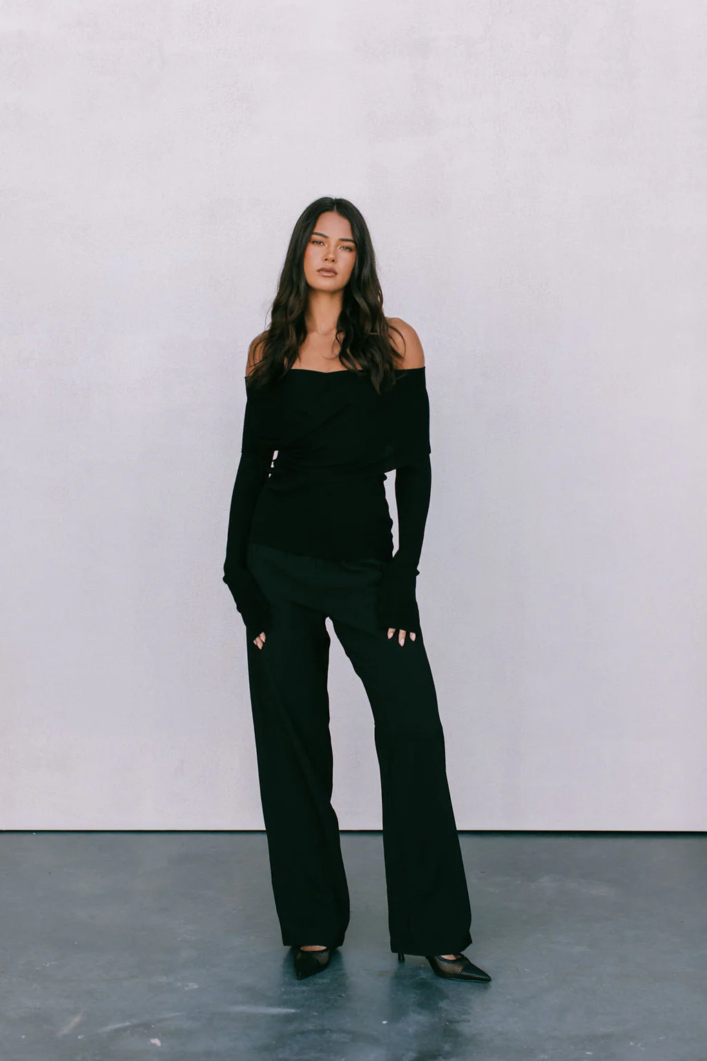 Flattering black long sleeve knitted top. Folded, ruched off shoulder neckline.