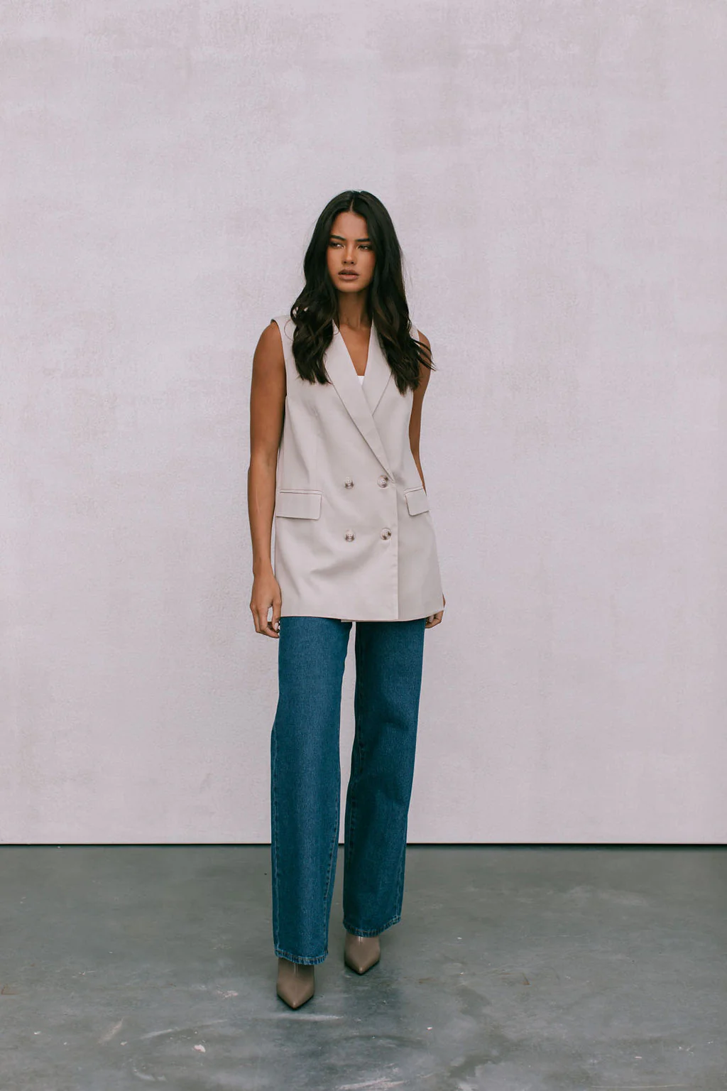 Upgrade your wardrobe in our Olas Blazer Vest, a sleeveless, oversized blazer-style vest designed for modern elegance. In a timeless, neutral beige tone, it’s the perfect layering piece. Style over a fitted top or wear solo for a bold statement.