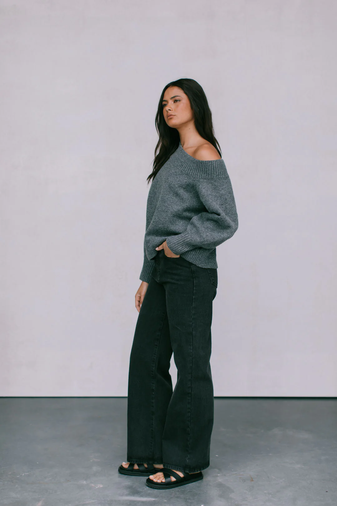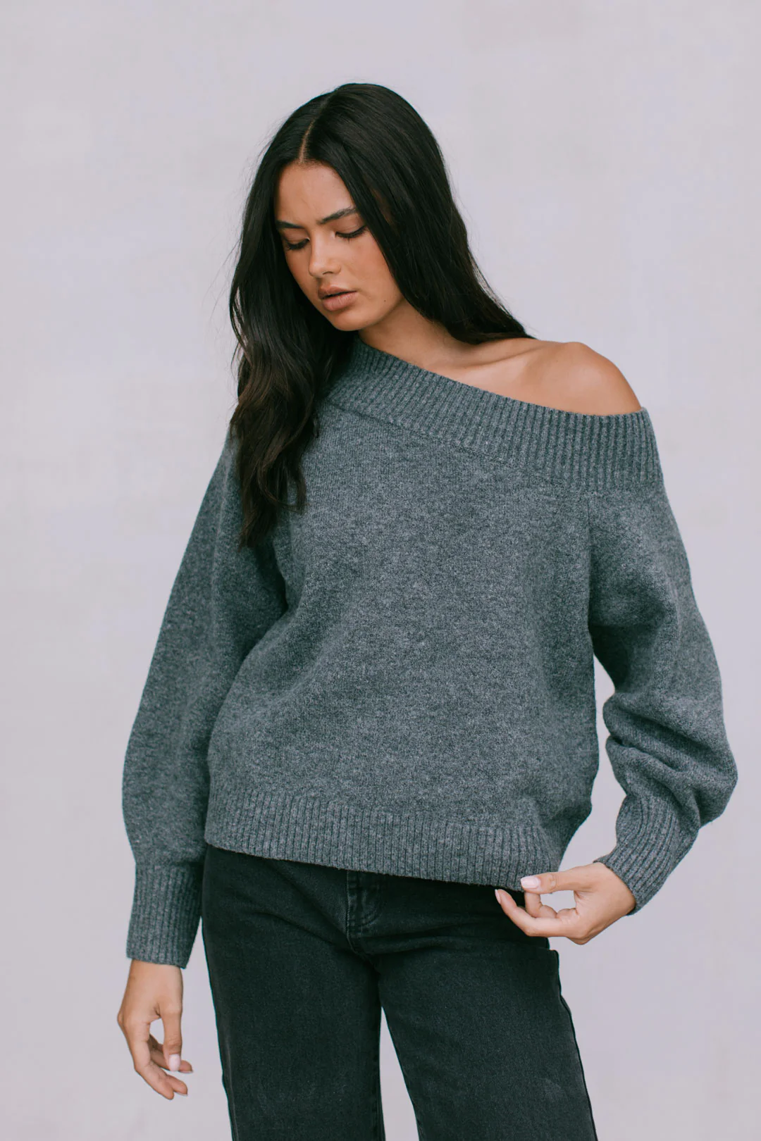 Our Omerson Knit Jumper is the ultimate blend of comfort + style. Crafted in a thick charcoal grey marle knit, this cozy staple offers an asymmetrical wide neckline, billowed sleeves + slightly cropped length for a relaxed yet refined look.