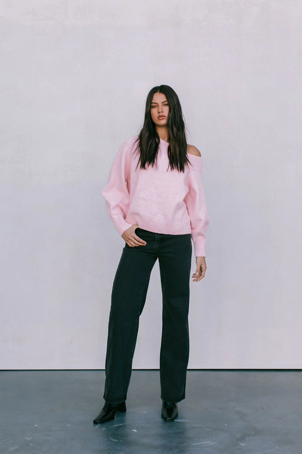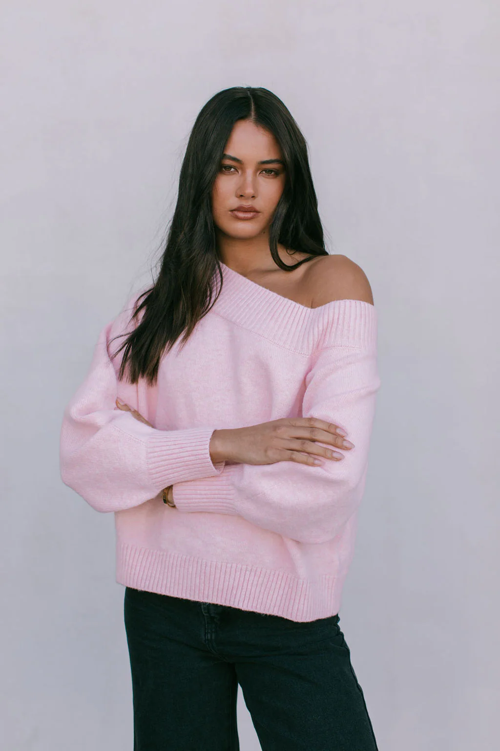 Our Omerson Knit Jumper is the ultimate blend of comfort + style. Crafted in a thick pink marle knit, this cozy staple offers an asymmetrical wide neckline, billowed sleeves +a slightly cropped length for a relaxed yet refined look.