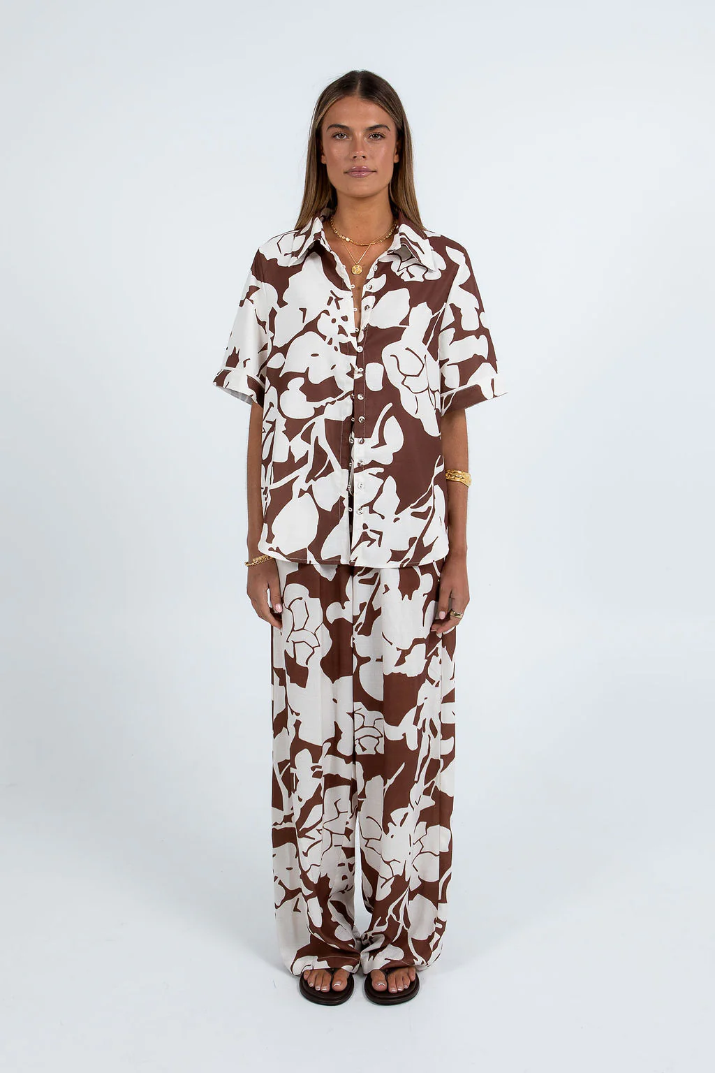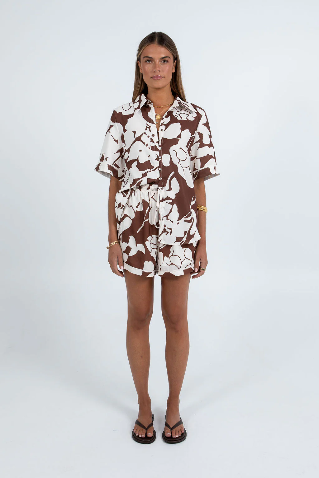 Say hello to our Petra Shirt by Cinque, exclusive to MMB. Showcased in a rich chocolate brown + cream floral print, this short sleeve, boxy shirt boasts a relaxed fit + chic design. Style as a set with the matching Matera Pants or Valletta Skirt.