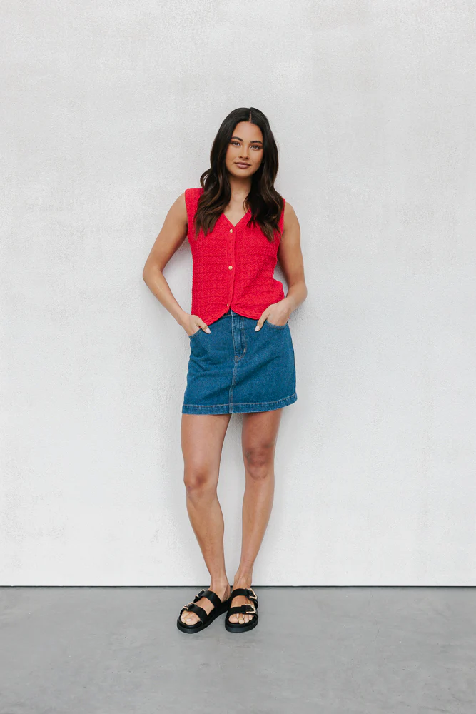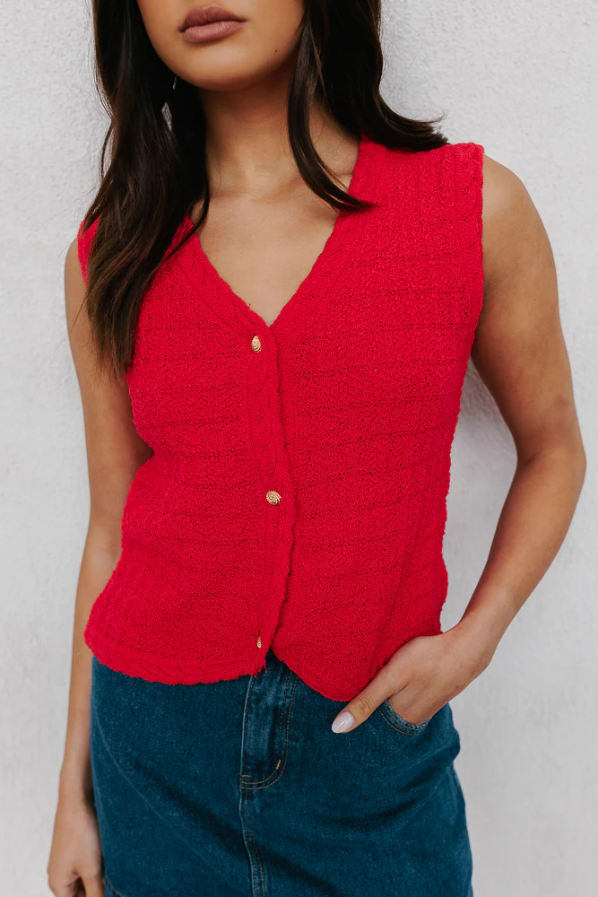 Meet our Petta Top ~ a bold red knitted vest designed to make a statement. Her relaxed fit boasts a v-neckline accented by sweet braided details + feature gold buttons at the front. Pair with denim for an effortlessly chic look!