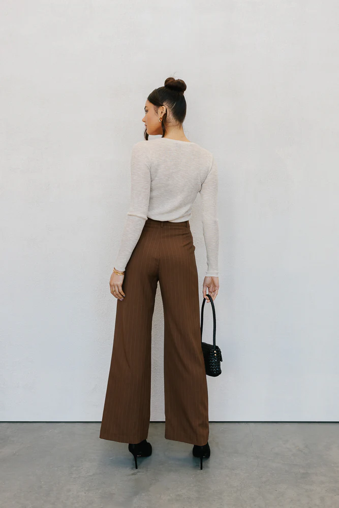 We're obsessed with our Philis Pants, in a stunning chocolate pinstripe, they are bold yet versatile. Her relaxed silhouette is effortless, pair back with a plain white tee for a casual fit, or style them perfectly with our coordinating Amie Top.