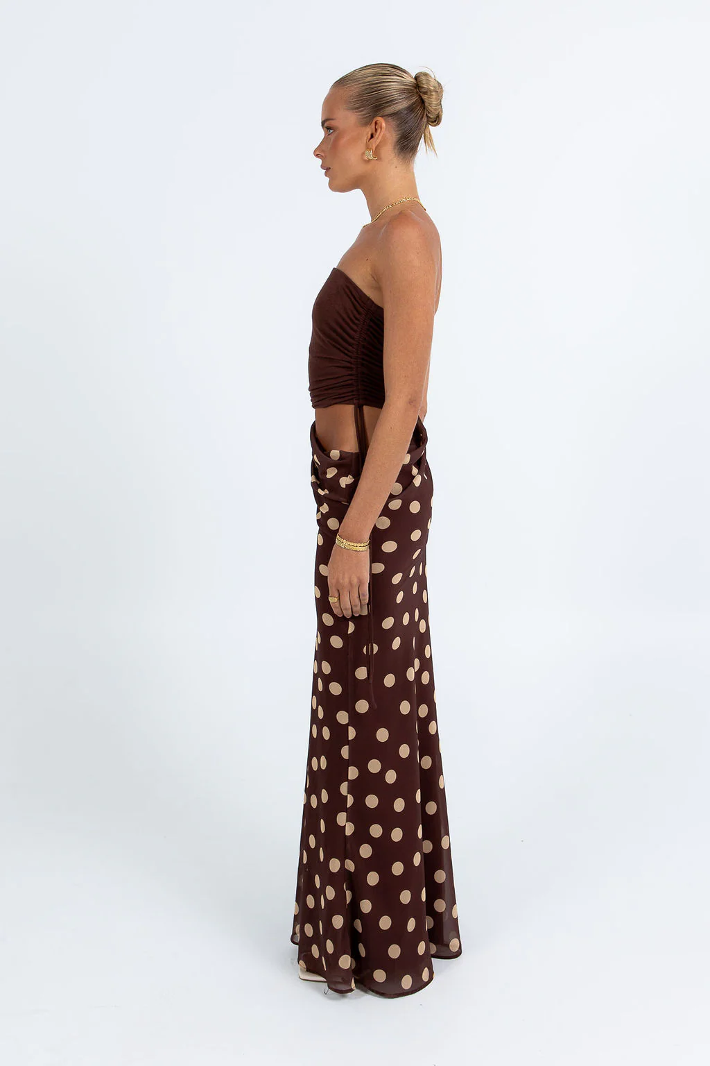 A chic maxi dress in a contemporary chocolate shade, accented with playful polka-dot detailing.