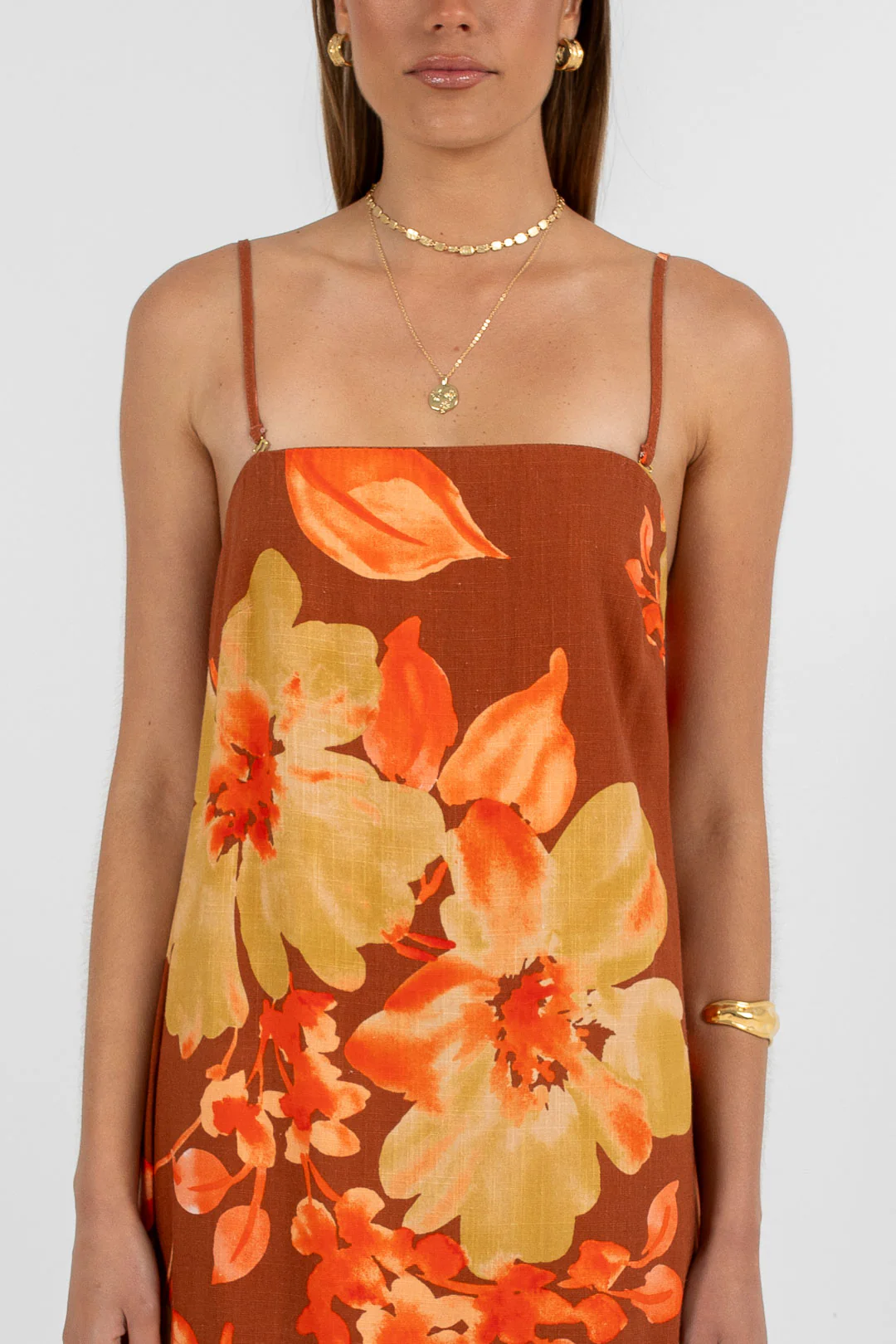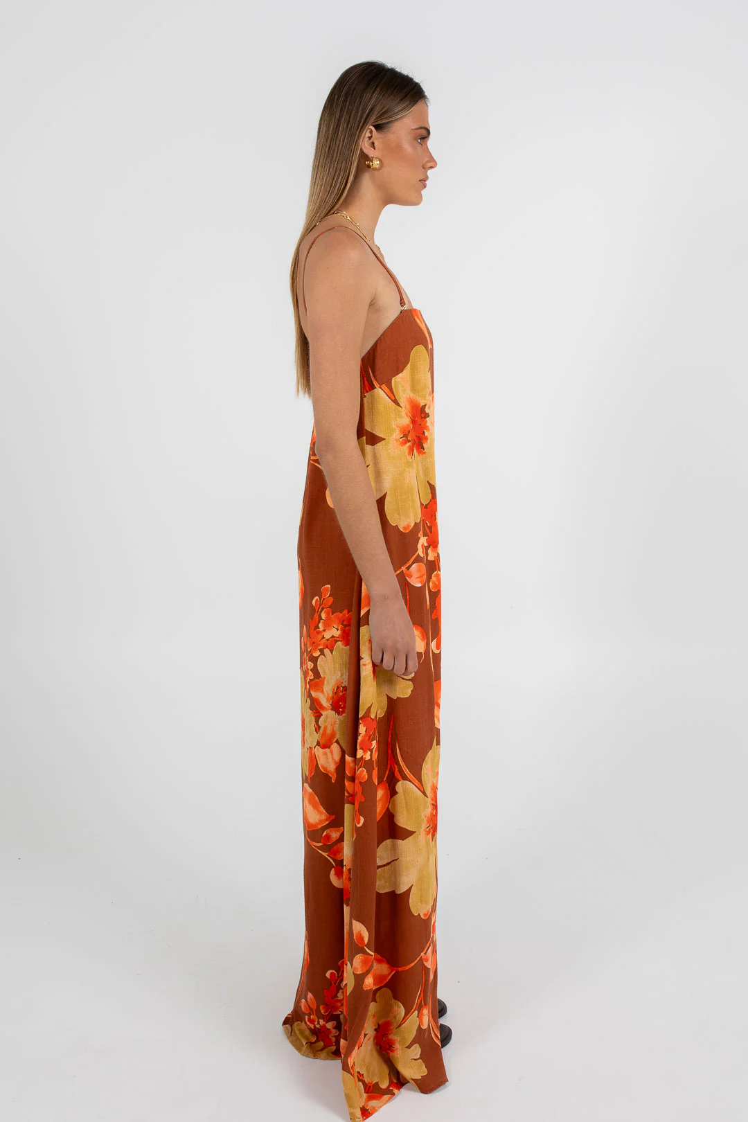 Stunning a-line maxi dress. Exclusive BAIA striking rust, peach + orange hues printed on a linen blend fabrication.