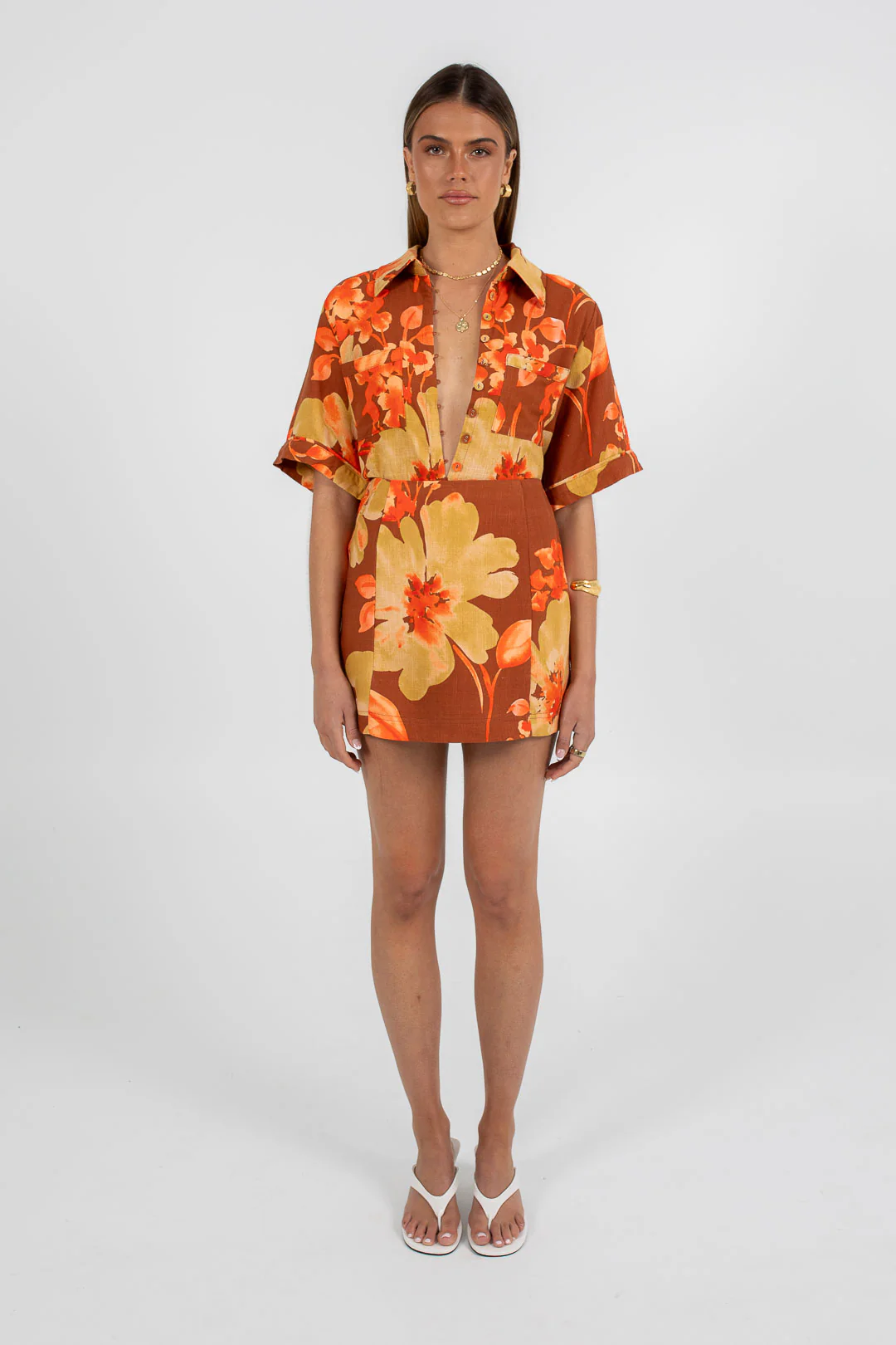 Relaxed, oversized Silhouette. Exclusive BAIA linen blend Peachy Floral Print with rust, peach + orange fabrication.