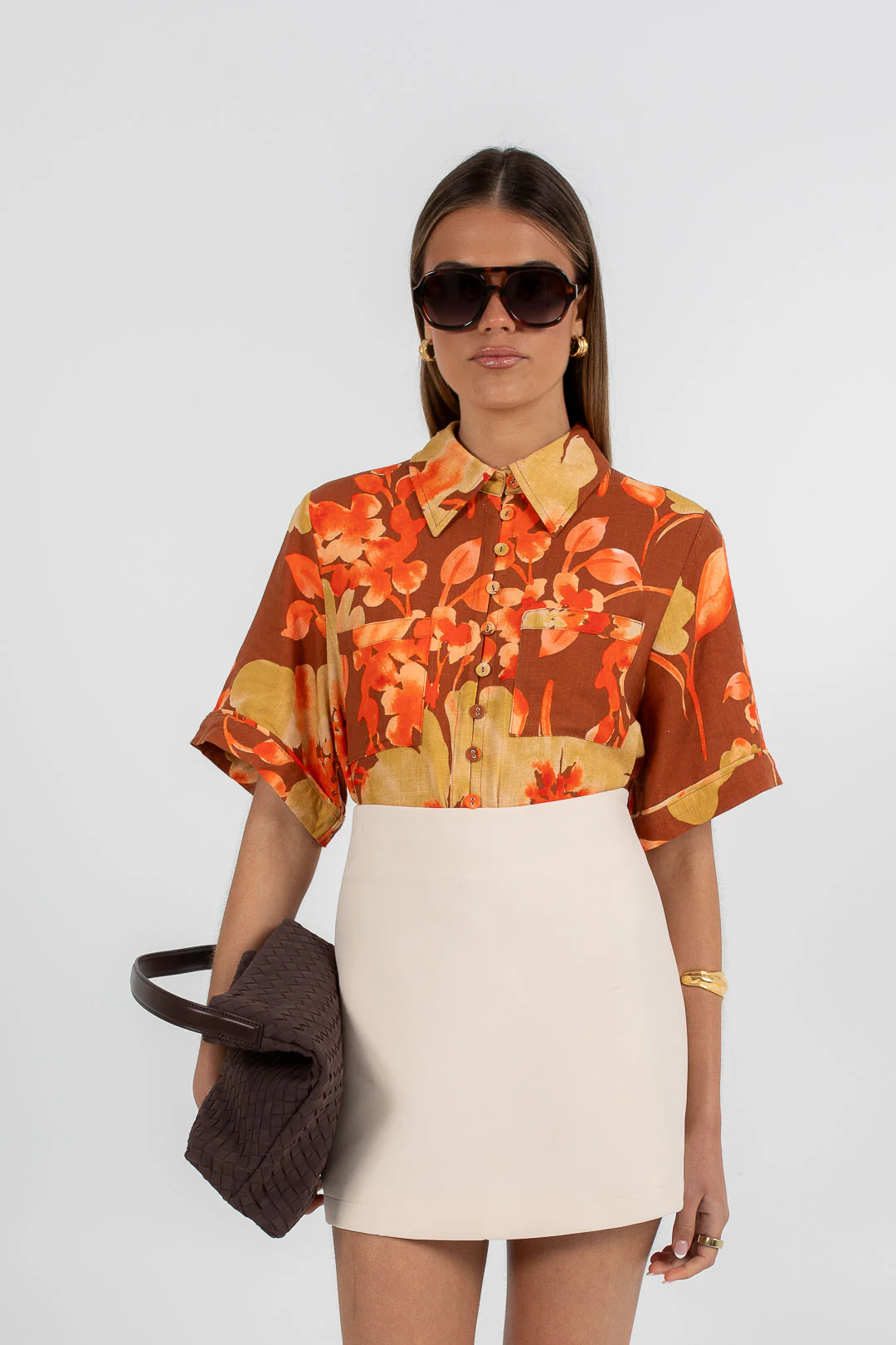 The Giorno Relaxed Shirt blends effortless style with refined elegance. Featuring rich rust, peachy, and orange hues, it pairs perfectly with our Zaira Mini Skirt or adds a chic touch to your favorite denim.