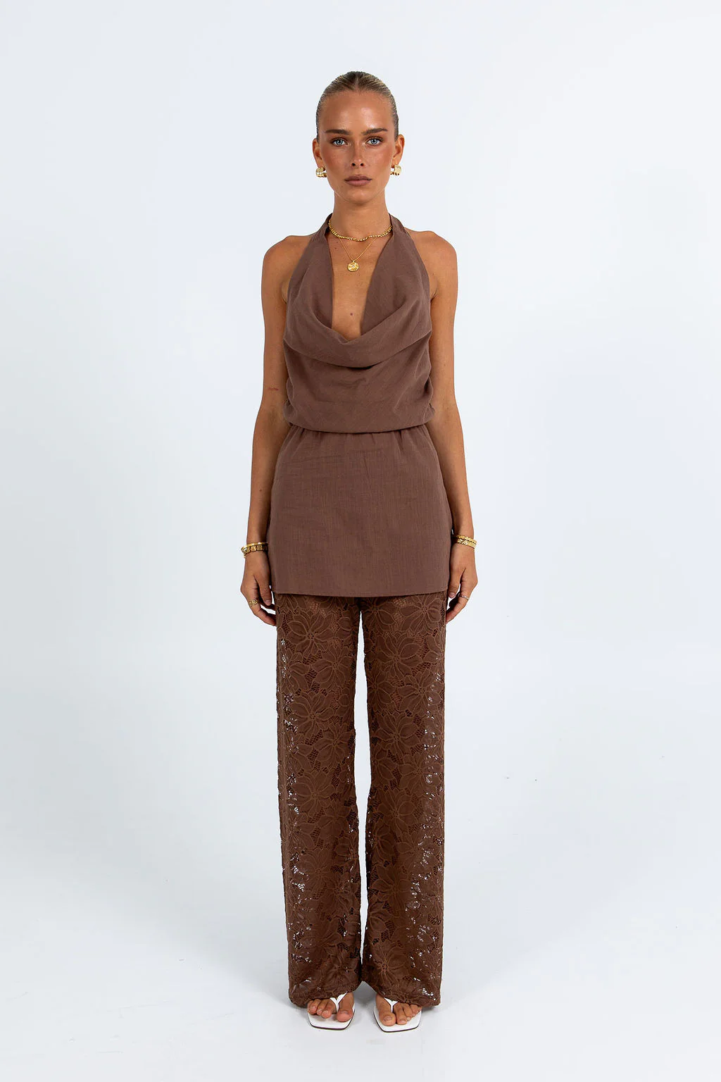 The Honor Set exudes sophistication with chocolate brown lace pants and a halter top featuring a flowing longer length and elegant cowl neckline. Perfectly balanced between modern edge and refined style for effortless day to night looks.