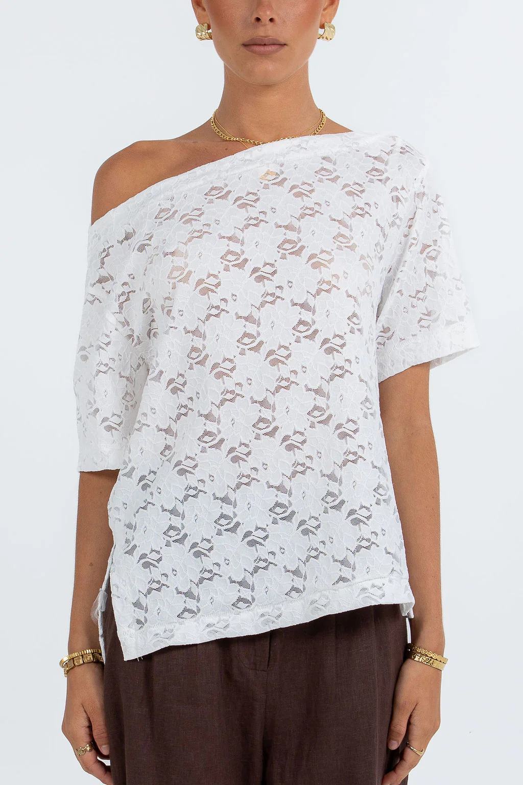 The Kelsey Top exudes sophistication in sheer white lace, featuring a boxy fit, short sleeves, and an asymmetrical neckline. Perfectly balanced between modern edge and feminine charm, she’s ideal for elevated day-to-night styling.
