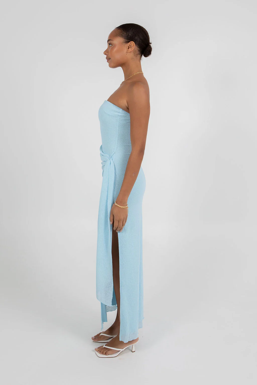 Beautiful trending baby blue maxi dress with strapless + side split detail.