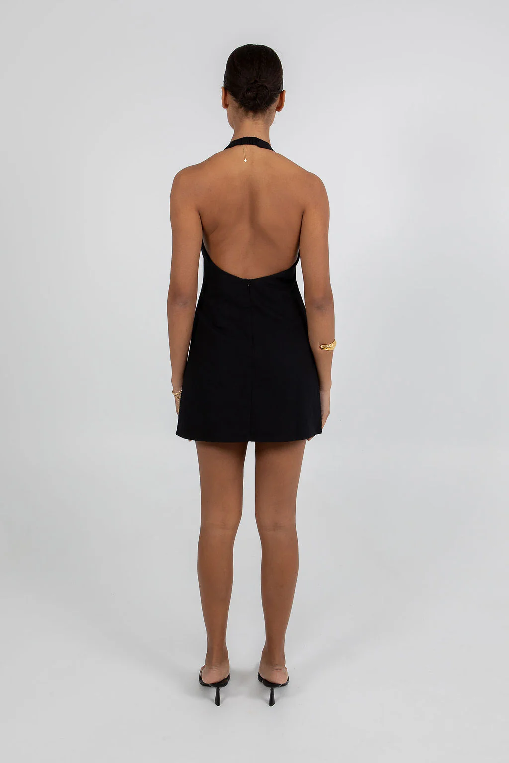 Our Unna Dress is a chic black mini in a flattering A-line silhouette. Crafted from soft cotton, it features a stylish halter neck, effortlessly combining comfort and elegance for day-to-night wear.