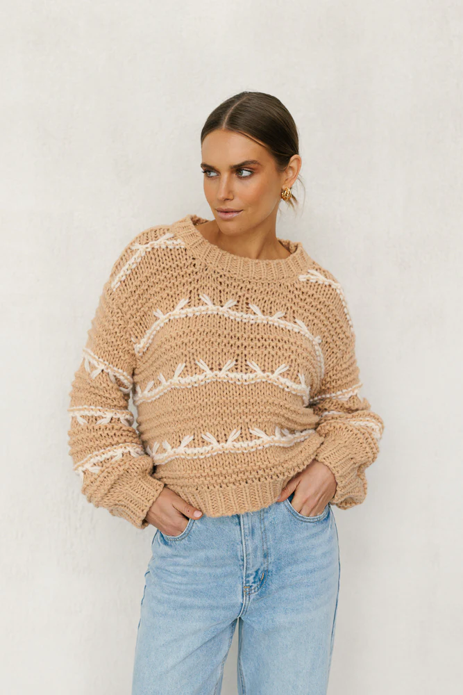 Meet our Plume Jumper, a cozy and stylish piece perfect for cooler days. This beige and white cable knit jumper features elegant cream contrast stitching. Designed with a round neckline and balloon sleeves, it offers a relaxed yet chic look.
